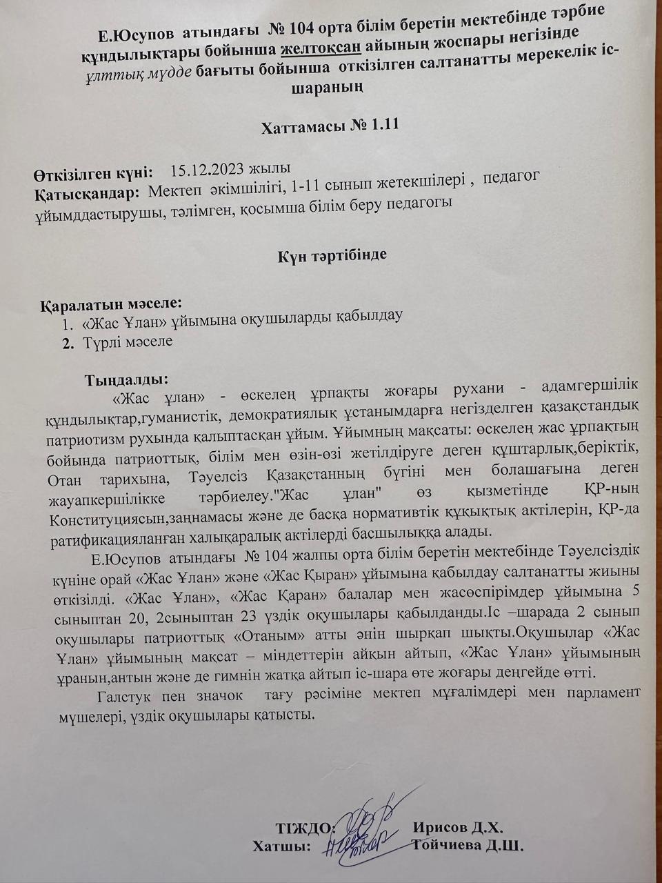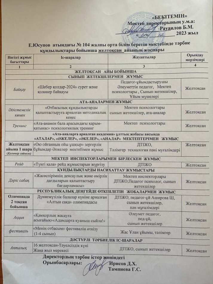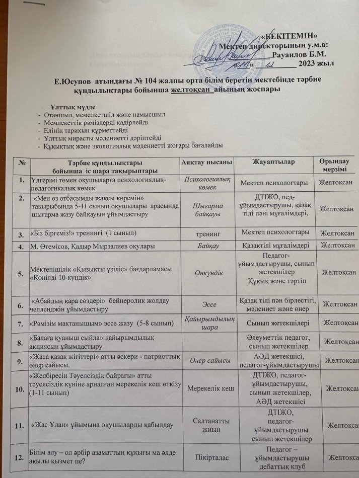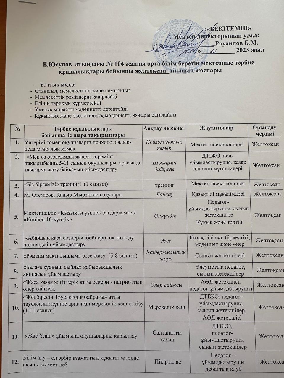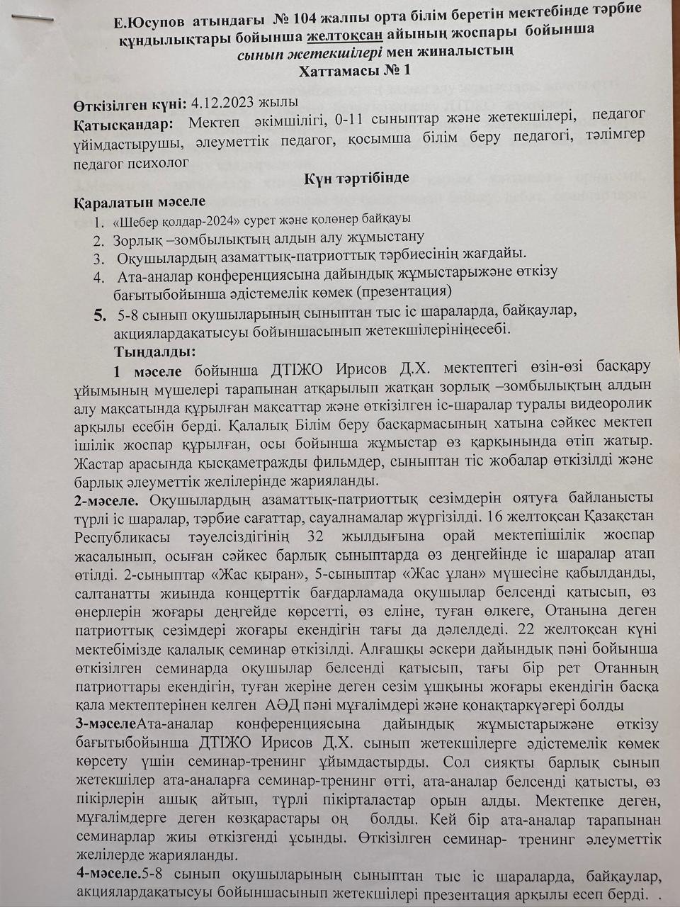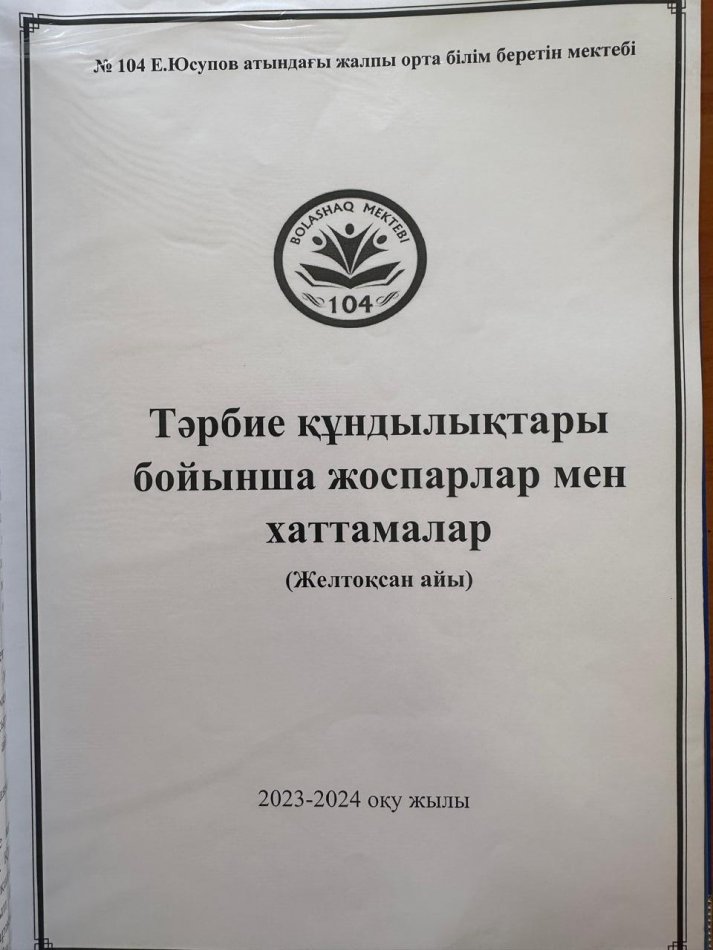 Тәрбие құндылықтары бойынша жоспарлар мен хаттамалар (ЖЕЛТОҚСАН АЙЫ) » Общеобразовательная школа №104 имени Е. Юсупова