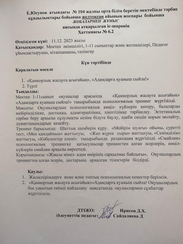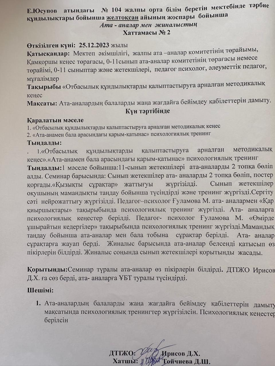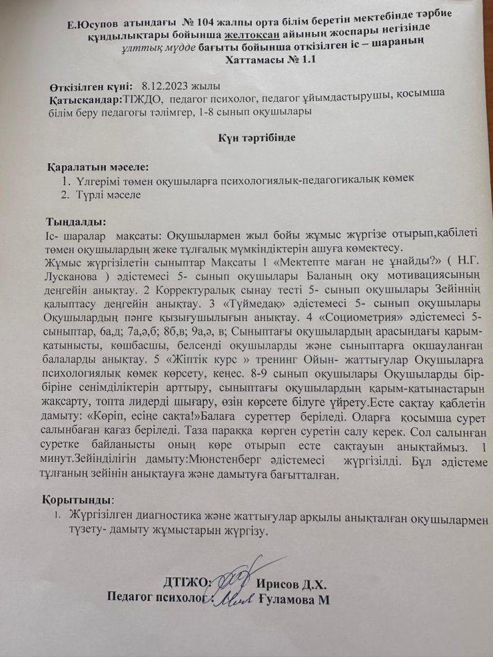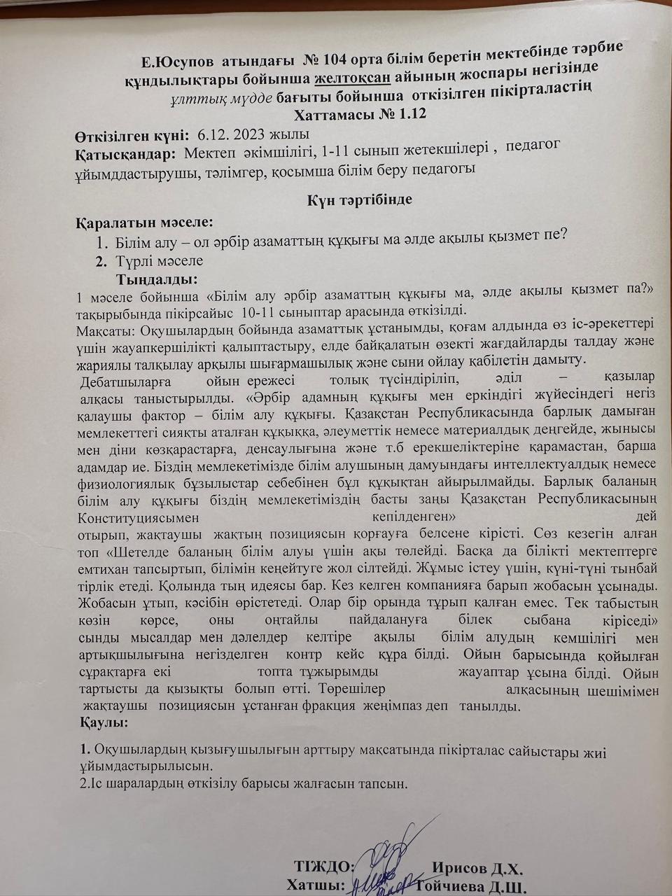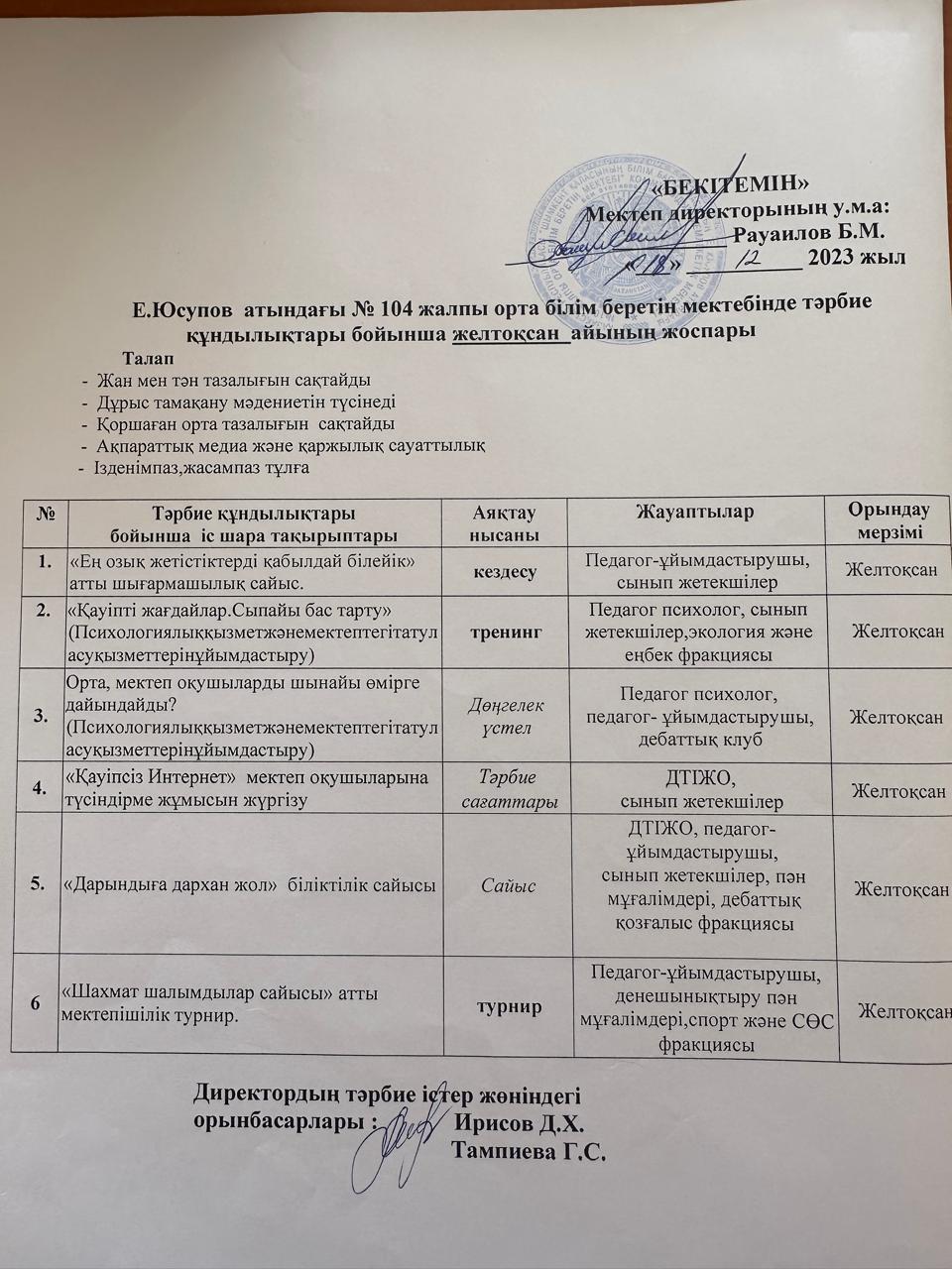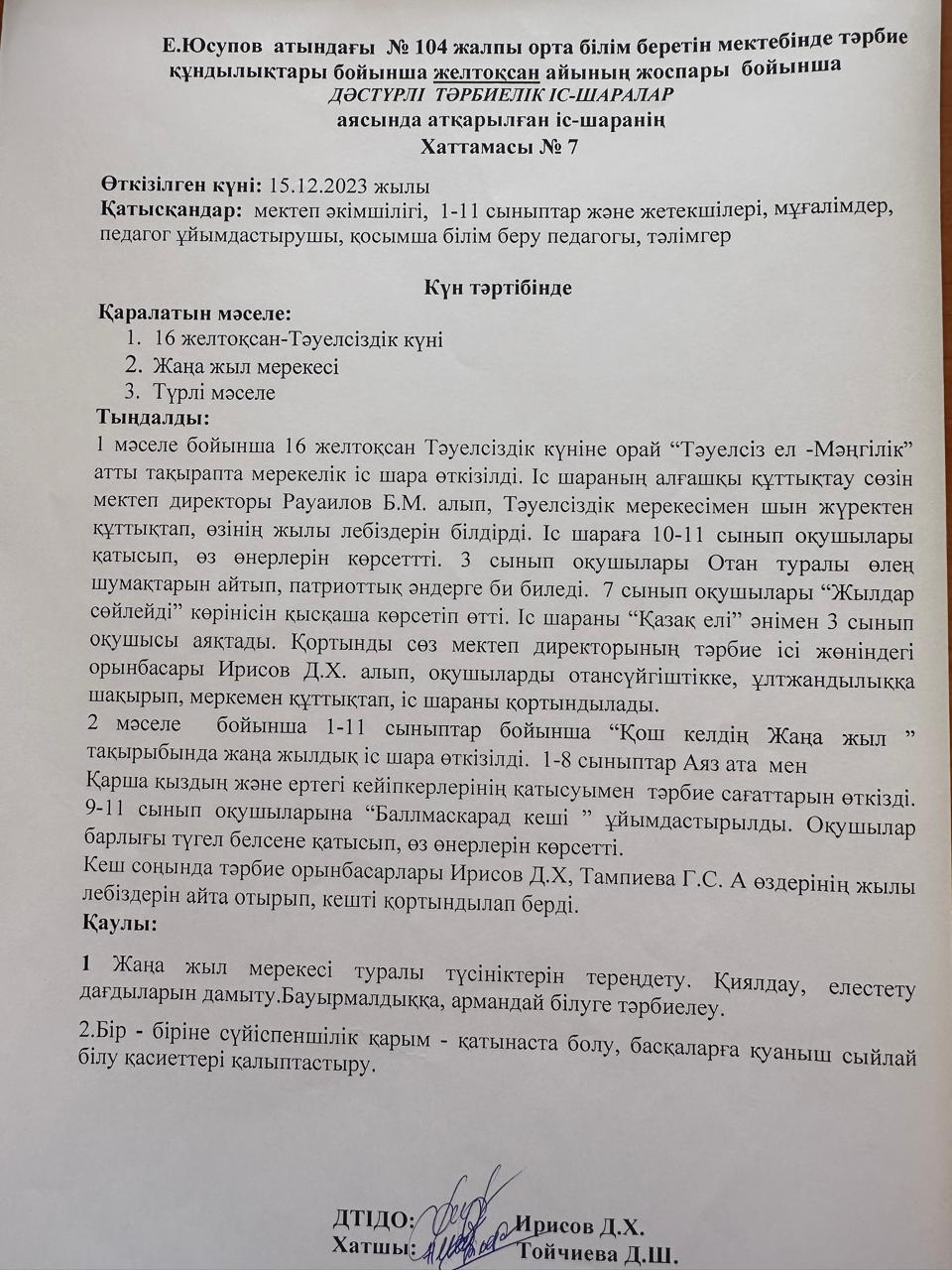 Тәрбие құндылықтары бойынша жоспарлар мен хаттамалар (ЖЕЛТОҚСАН АЙЫ) » Общеобразовательная школа №104 имени Е. Юсупова