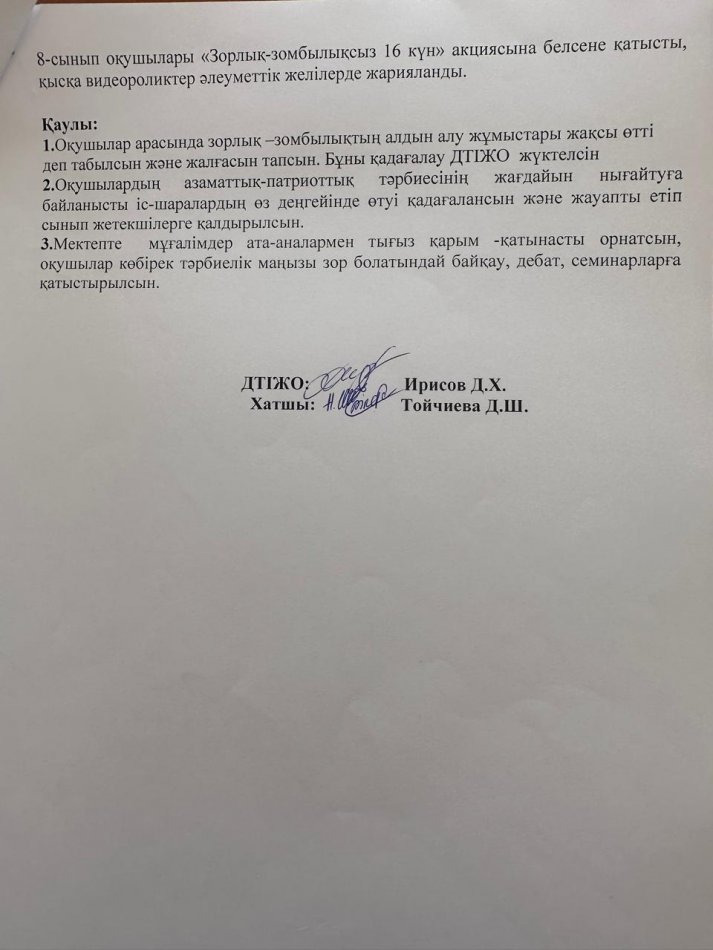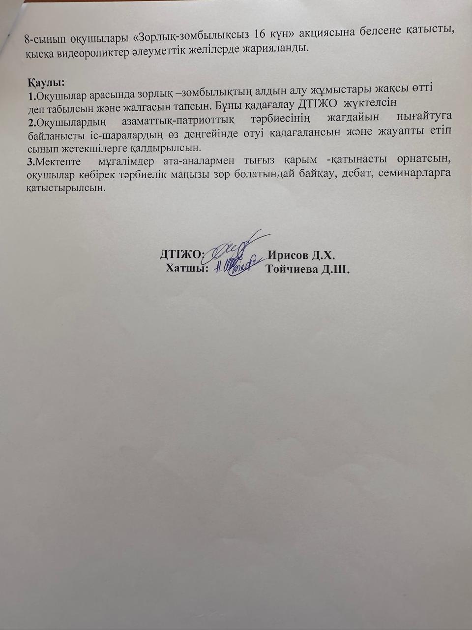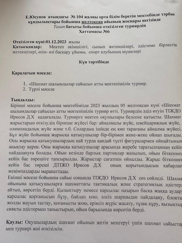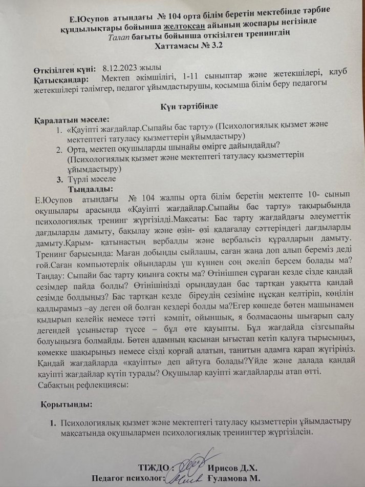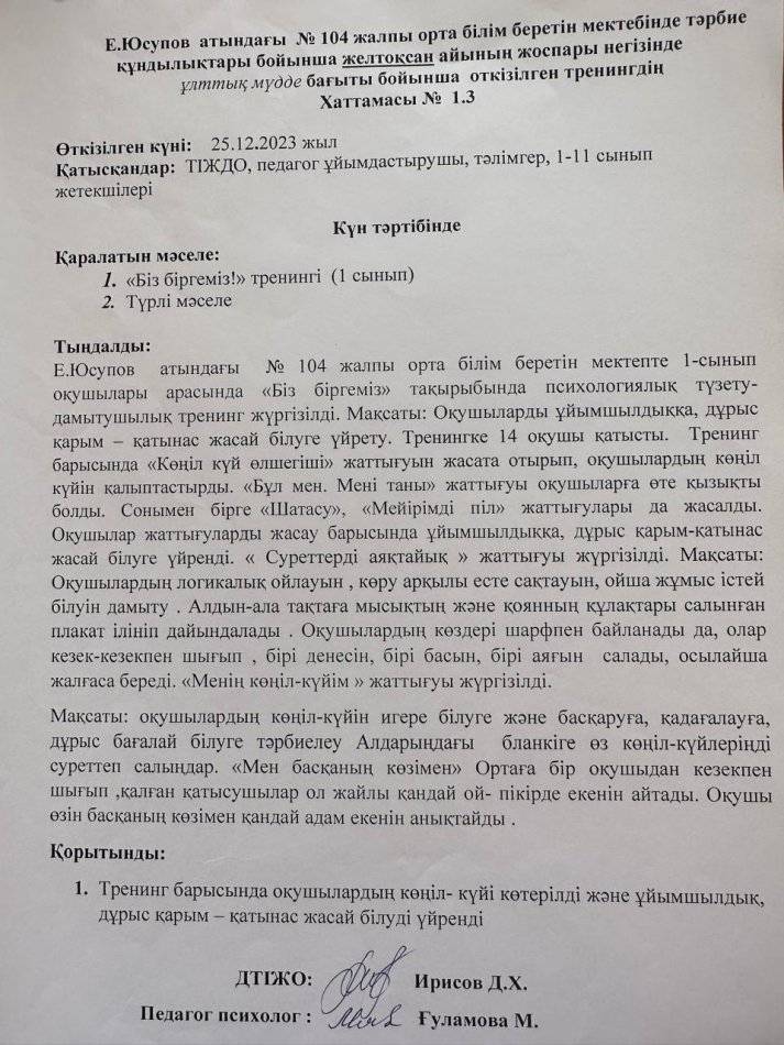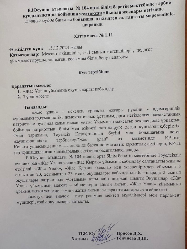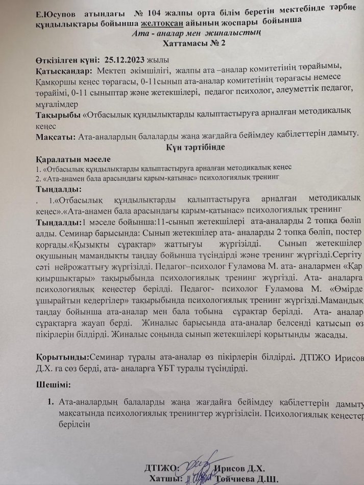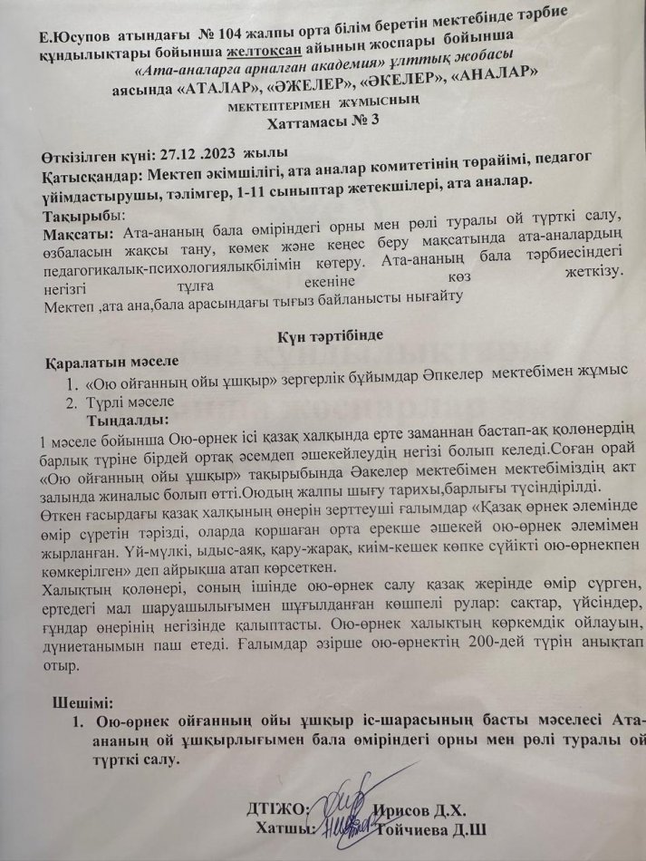 Тәрбие құндылықтары бойынша жоспарлар мен хаттамалар (ЖЕЛТОҚСАН АЙЫ) » Общеобразовательная школа №104 имени Е. Юсупова