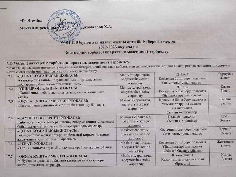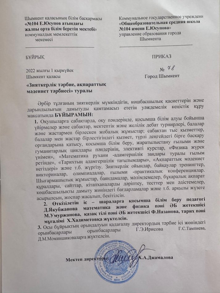 ЗИЯТКЕРЛІК ТӘРБИЕ, АҚПАРАТТЫҚ МӘДЕНИЕТ ТӘРБИЕСІ » Общеобразовательная школа №104 имени Е. Юсупова