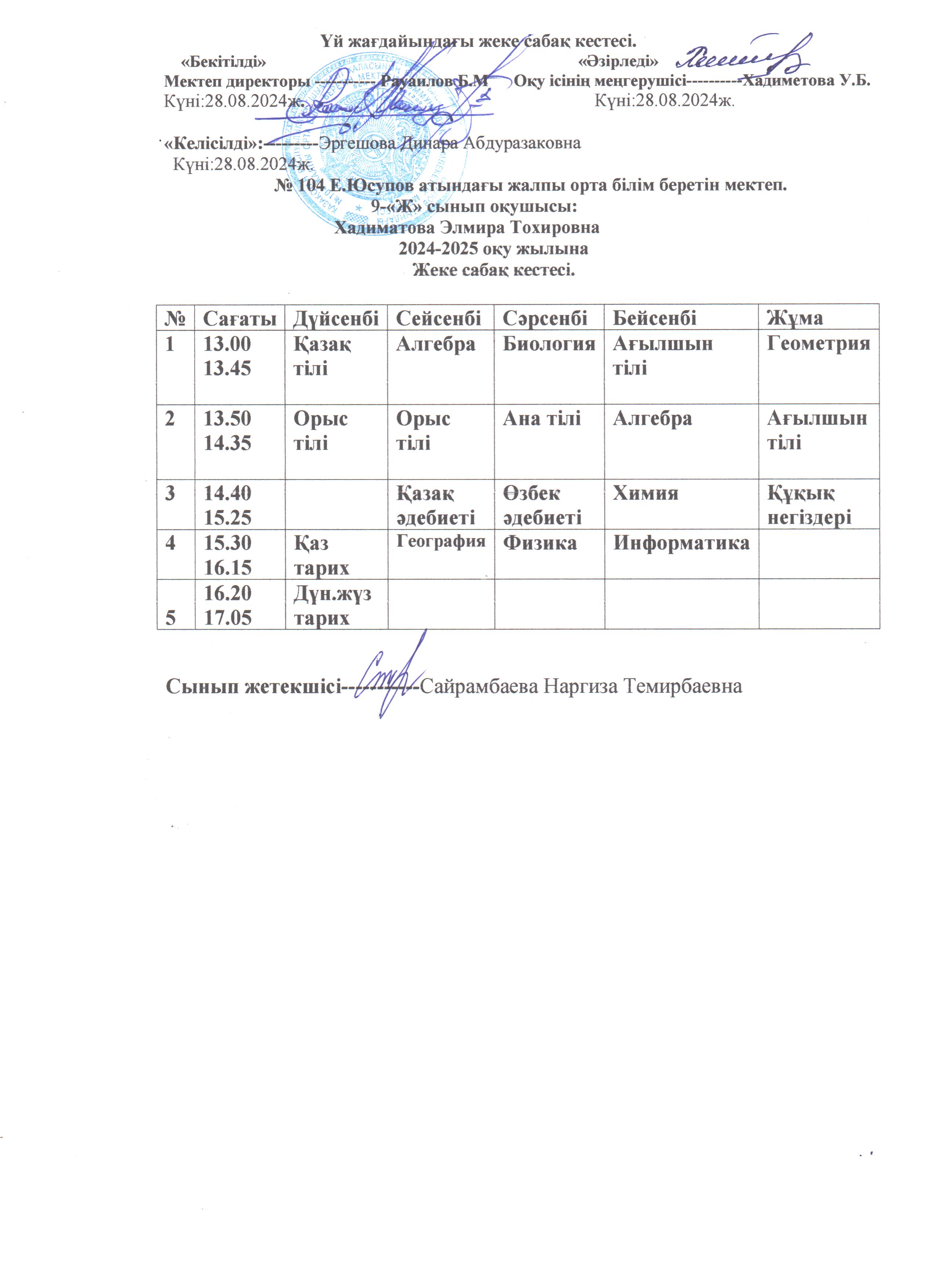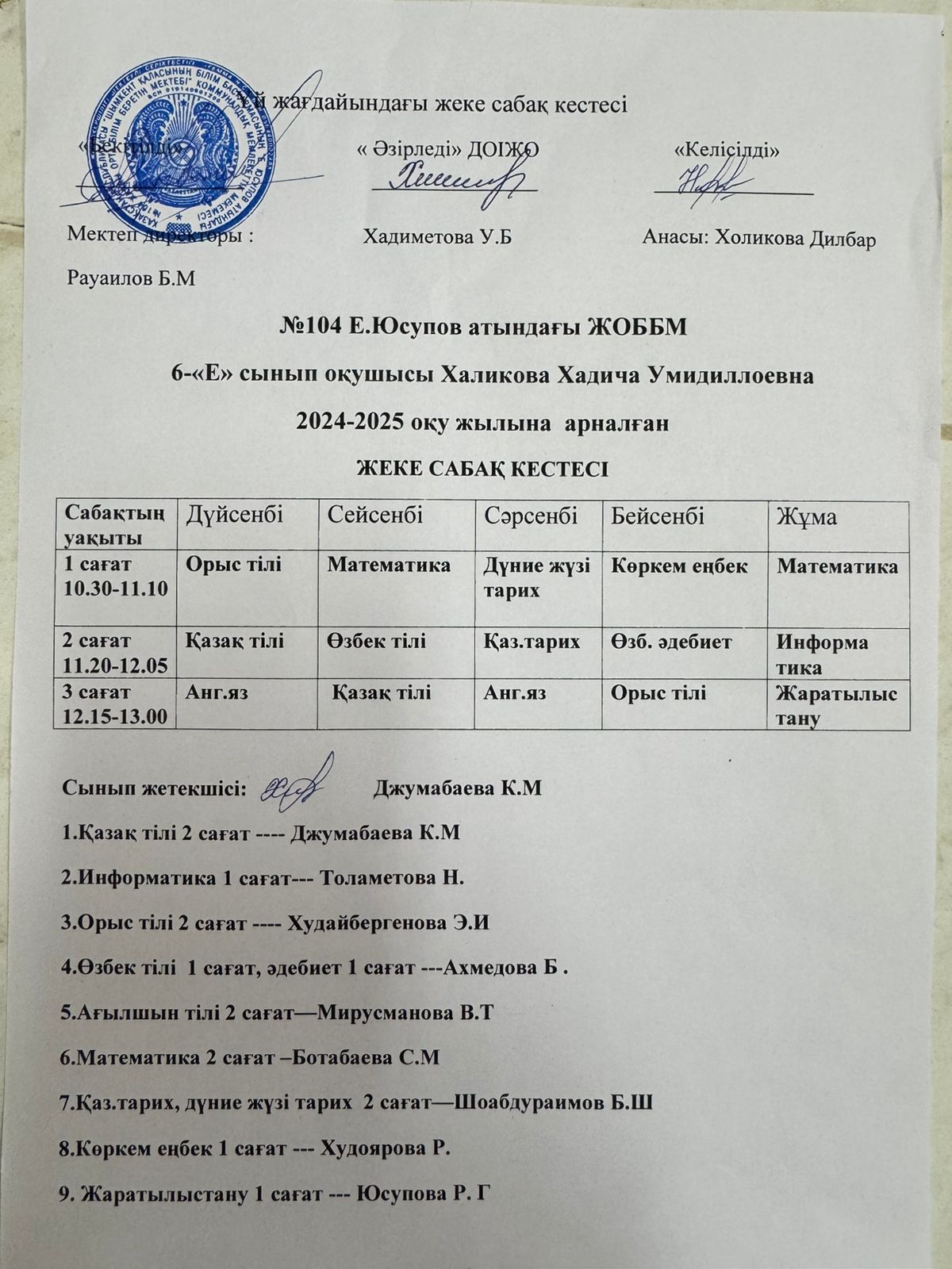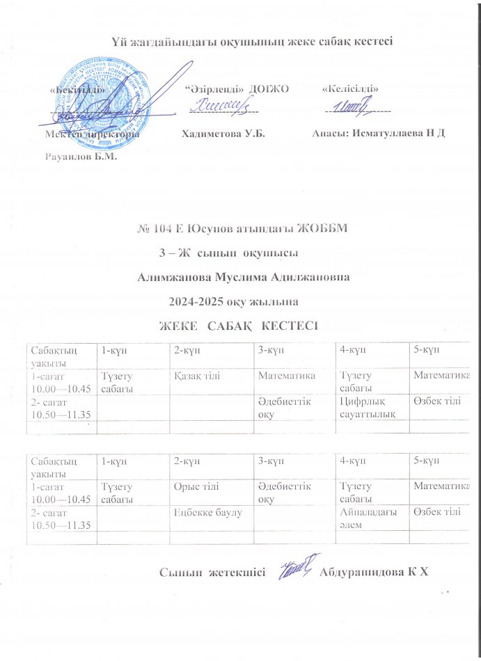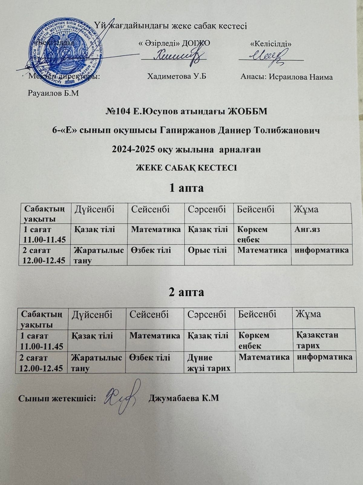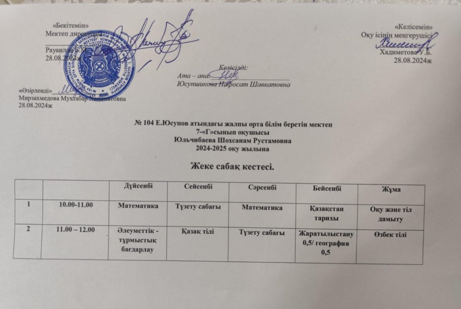 ҮЙДЕ ОҚЫТУ БОЙНША ЖЕКЕ САБАҚ КЕСТЕЛЕРІ 2024-2025 ОҚУ ЖЫЛЫ » Общеобразовательная школа №104 имени Е. Юсупова