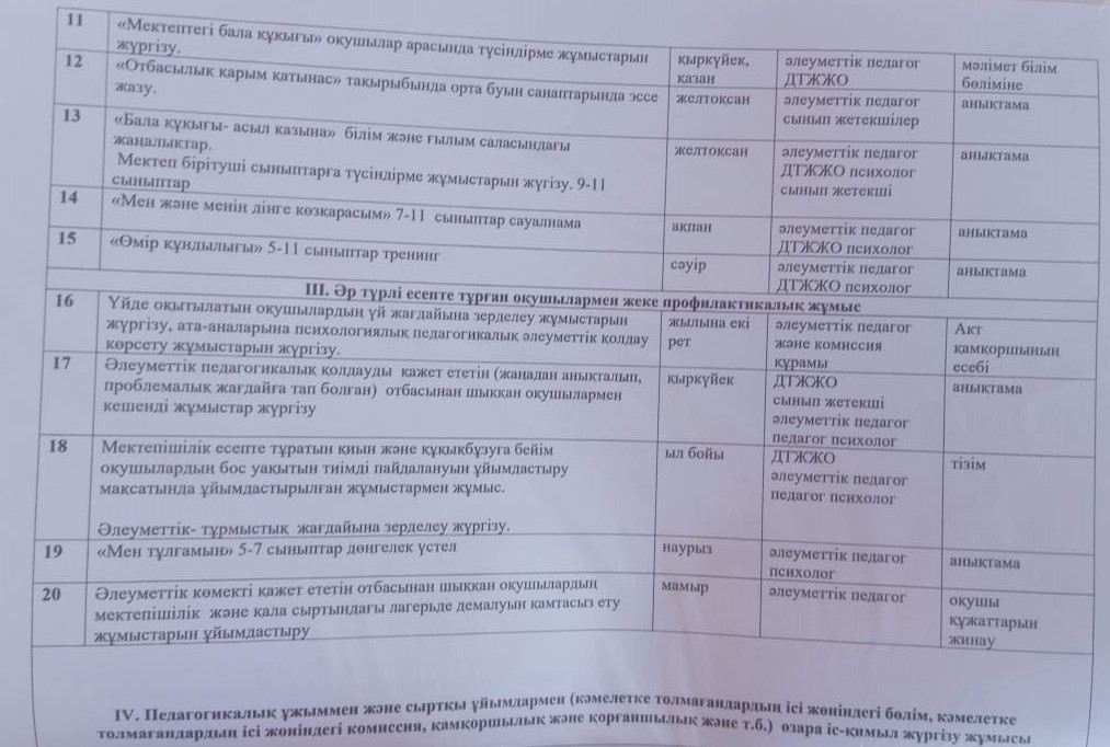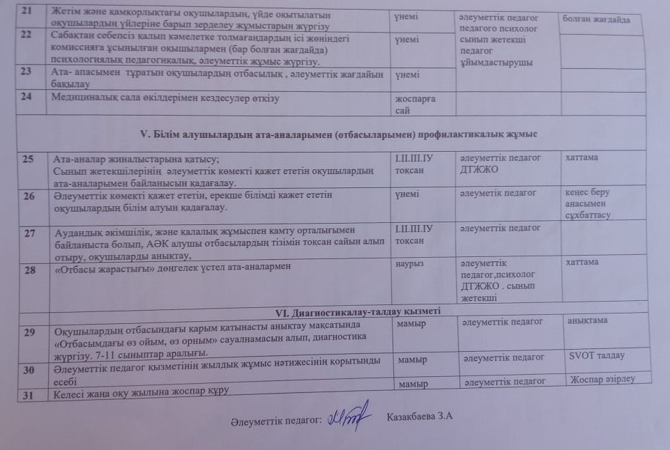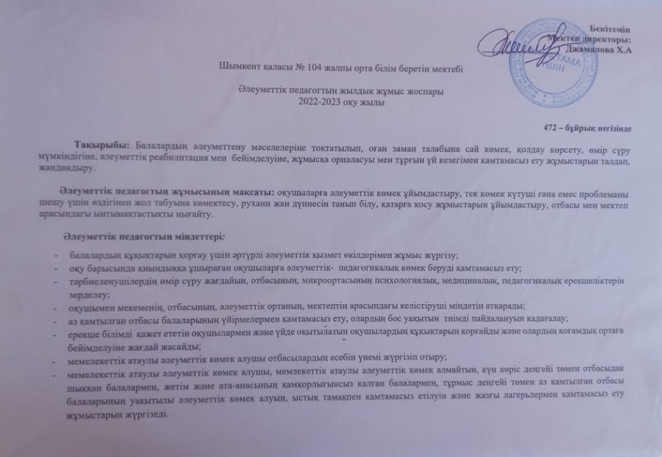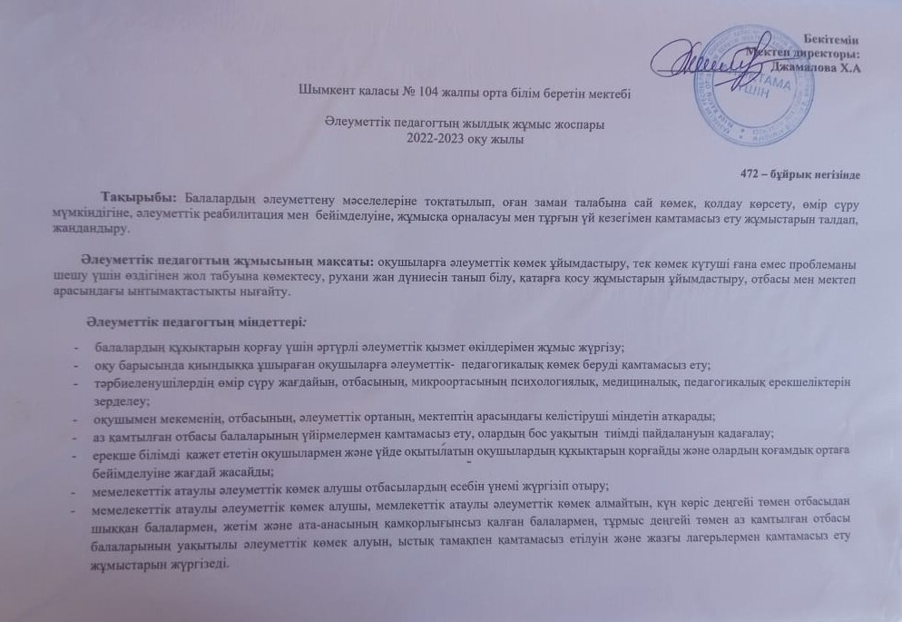 Әлеуметтік педагогтың жылдық жұмыс жоспары (2022-2023 оқу жылы) » Общеобразовательная школа №104 имени Е. Юсупова