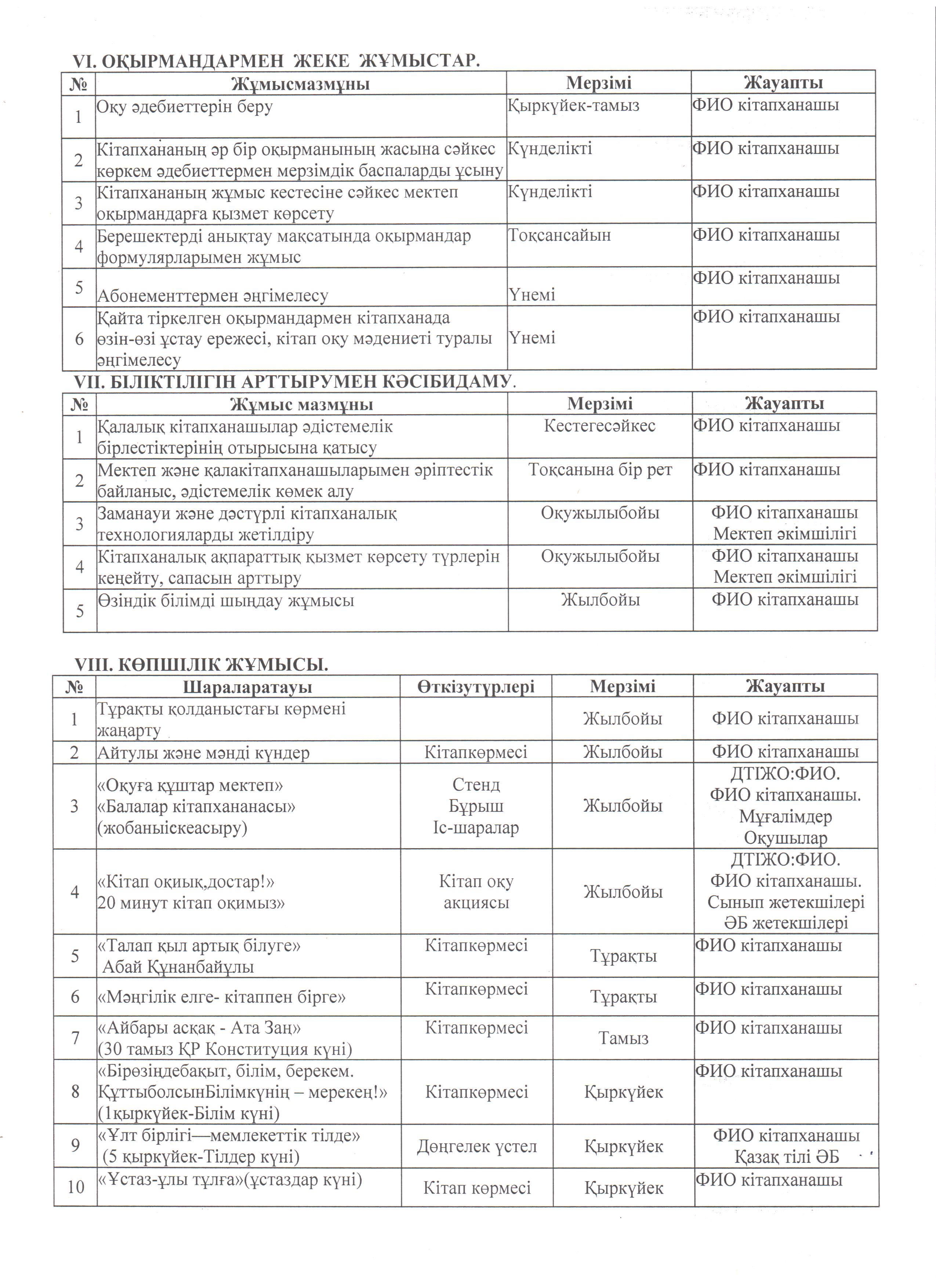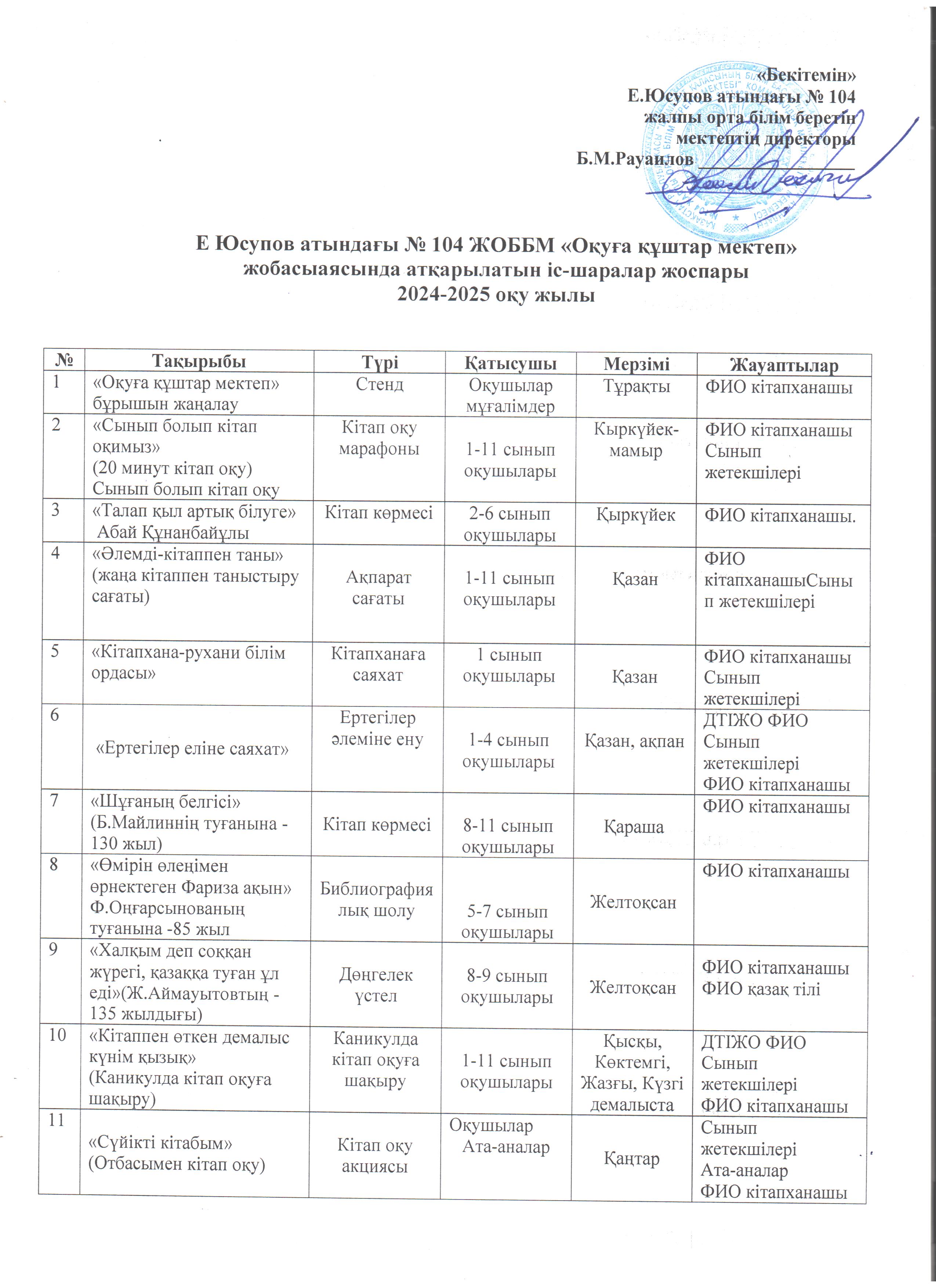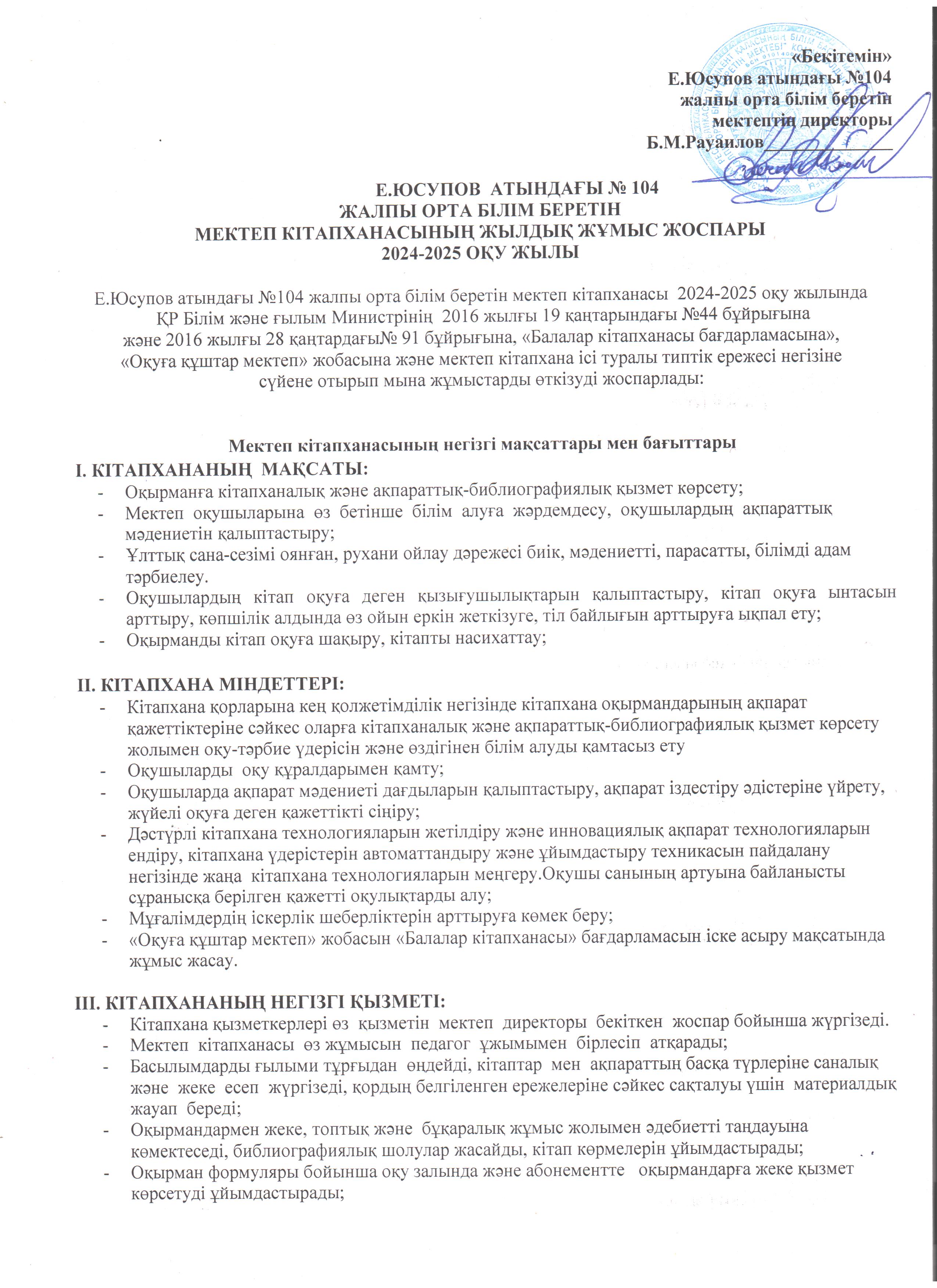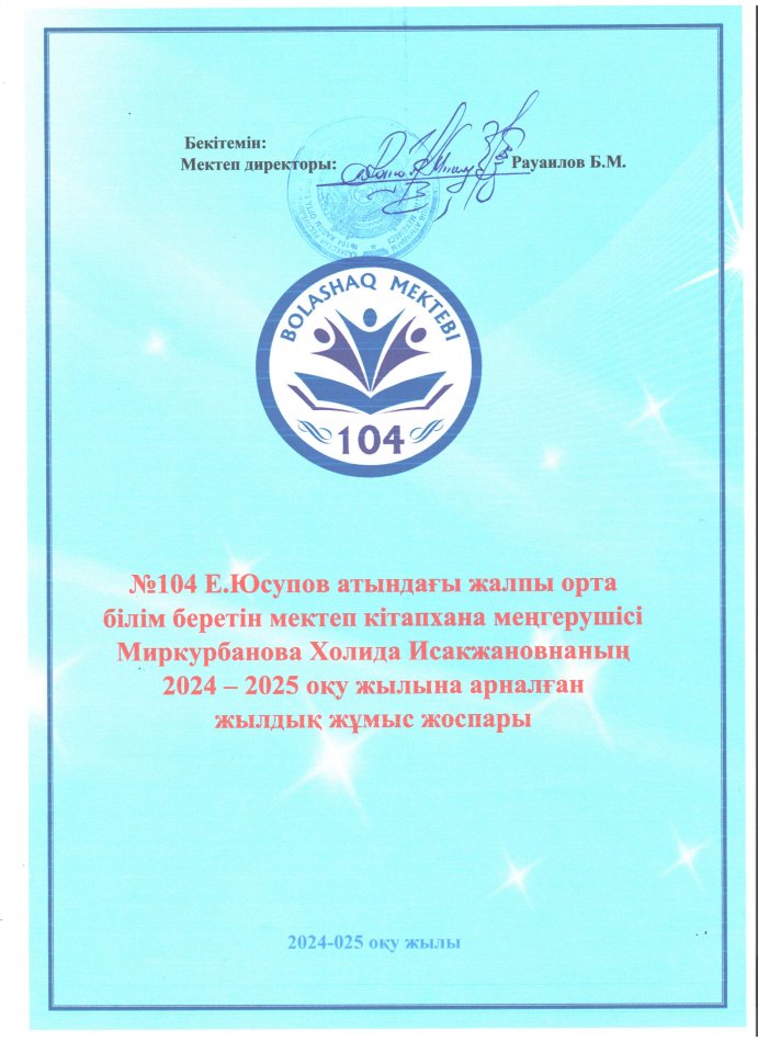 КІТАПХАНАШЫЛАРДЫҢ 2024-2024 ОҚУ ЖЫЛЫНА АРНАЛҒАН ЖЫЛДЫҚ ЖҰМЫС ЖОСПАРЫ » Общеобразовательная школа №104 имени Е. Юсупова