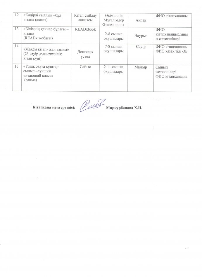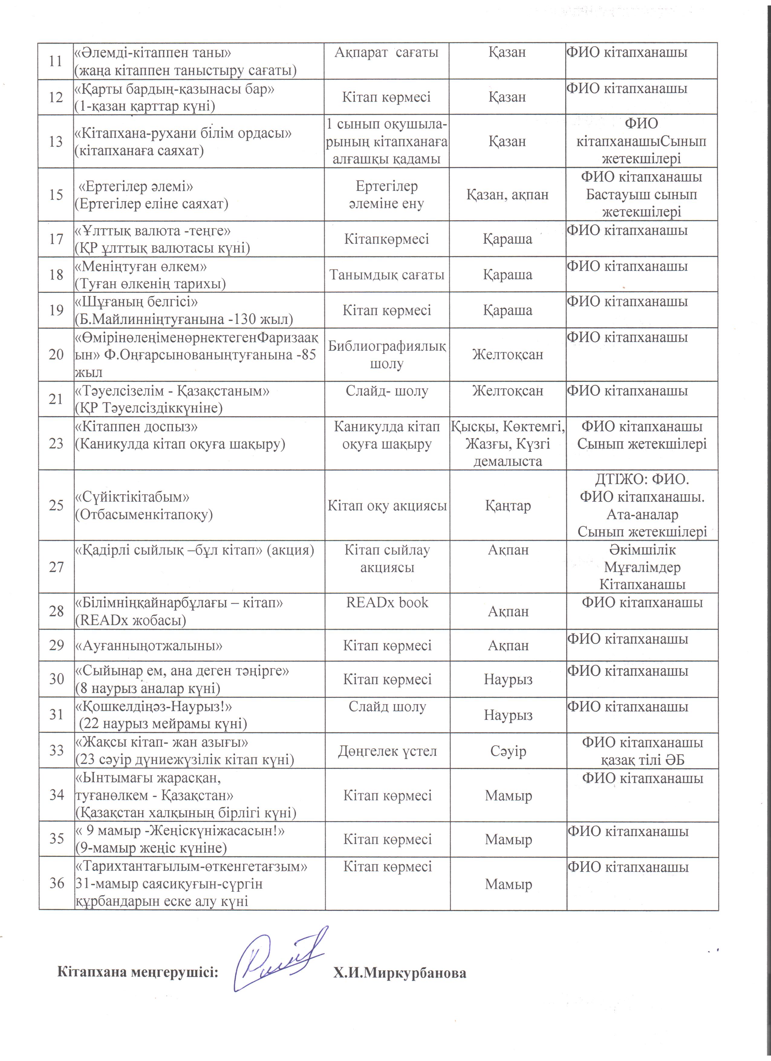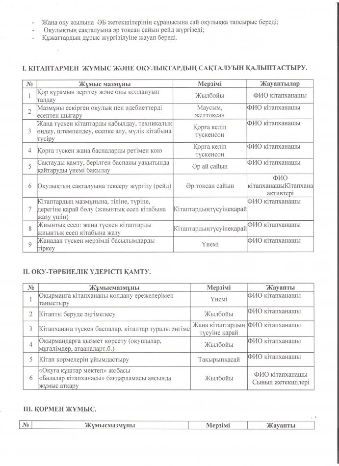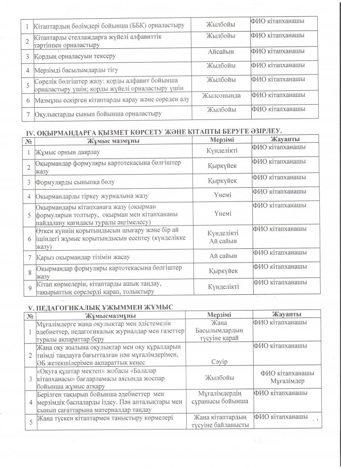 КІТАПХАНАШЫЛАРДЫҢ 2024-2024 ОҚУ ЖЫЛЫНА АРНАЛҒАН ЖЫЛДЫҚ ЖҰМЫС ЖОСПАРЫ » Общеобразовательная школа №104 имени Е. Юсупова