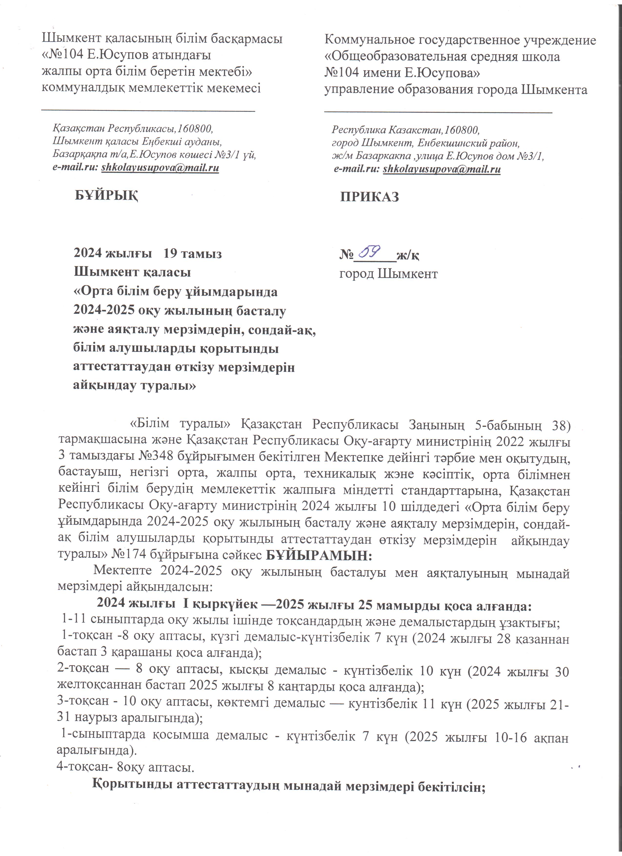 МЕКТЕПТЕ 2024-2025 ОҚУ ЖЫЛЫҢ БАСТАЛУЫ МЕН АЯҚТАЛУЫНЫҢ БҰЙРЫҒЫ » Общеобразовательная школа №104 имени Е. Юсупова