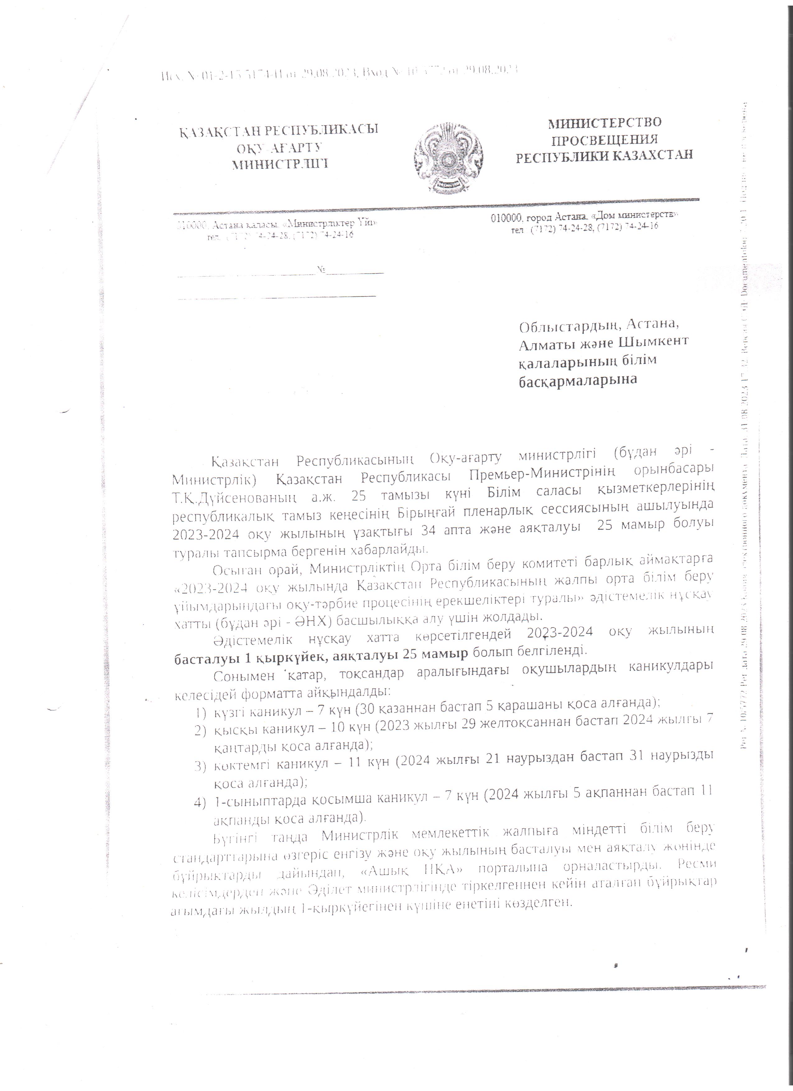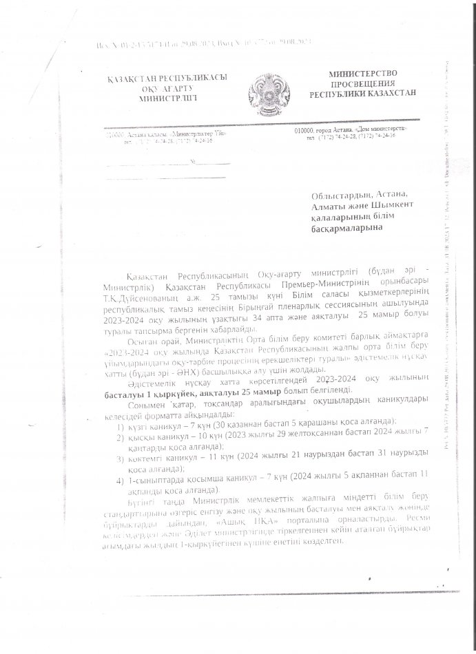 » » » МЕКТЕПТЕ 2023-2024 ОҚУ ЖЫЛЫҢ БАСТАЛУЫ МЕН АЯҚТАЛУЫНЫҢ БҰЙРЫҒЫ