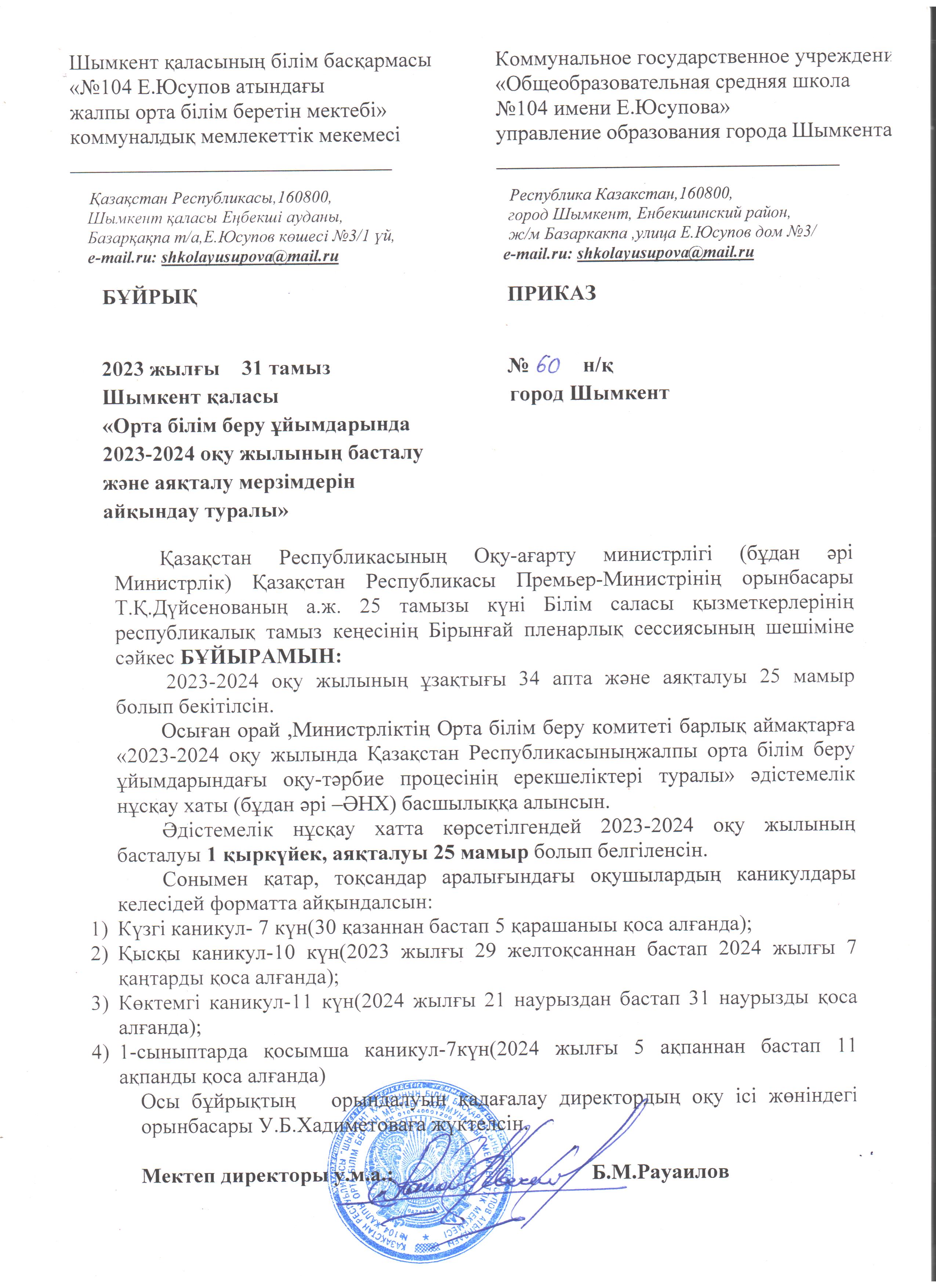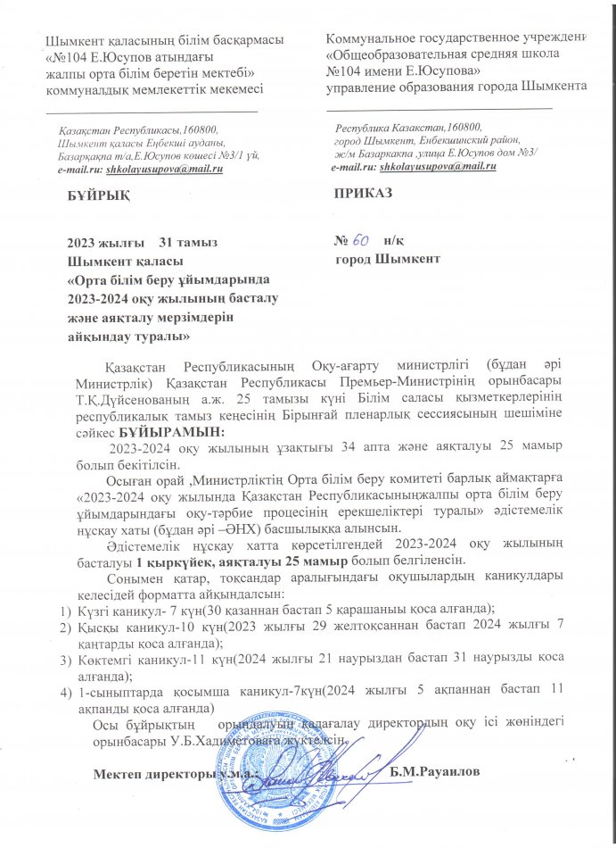 МЕКТЕПТЕ 2023-2024 ОҚУ ЖЫЛЫҢ БАСТАЛУЫ МЕН АЯҚТАЛУЫНЫҢ БҰЙРЫҒЫ » Общеобразовательная школа №104 имени Е. Юсупова