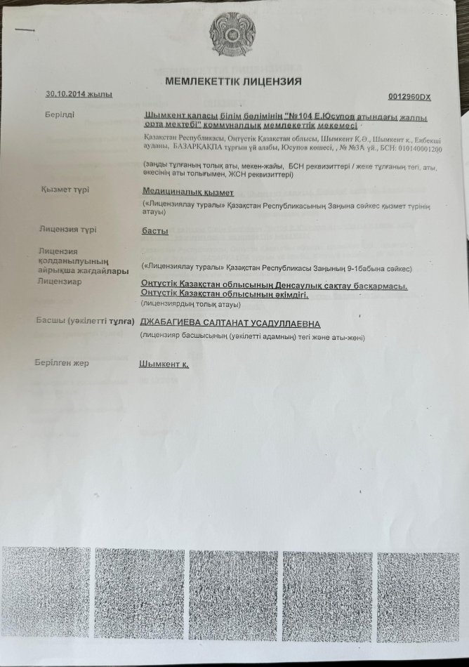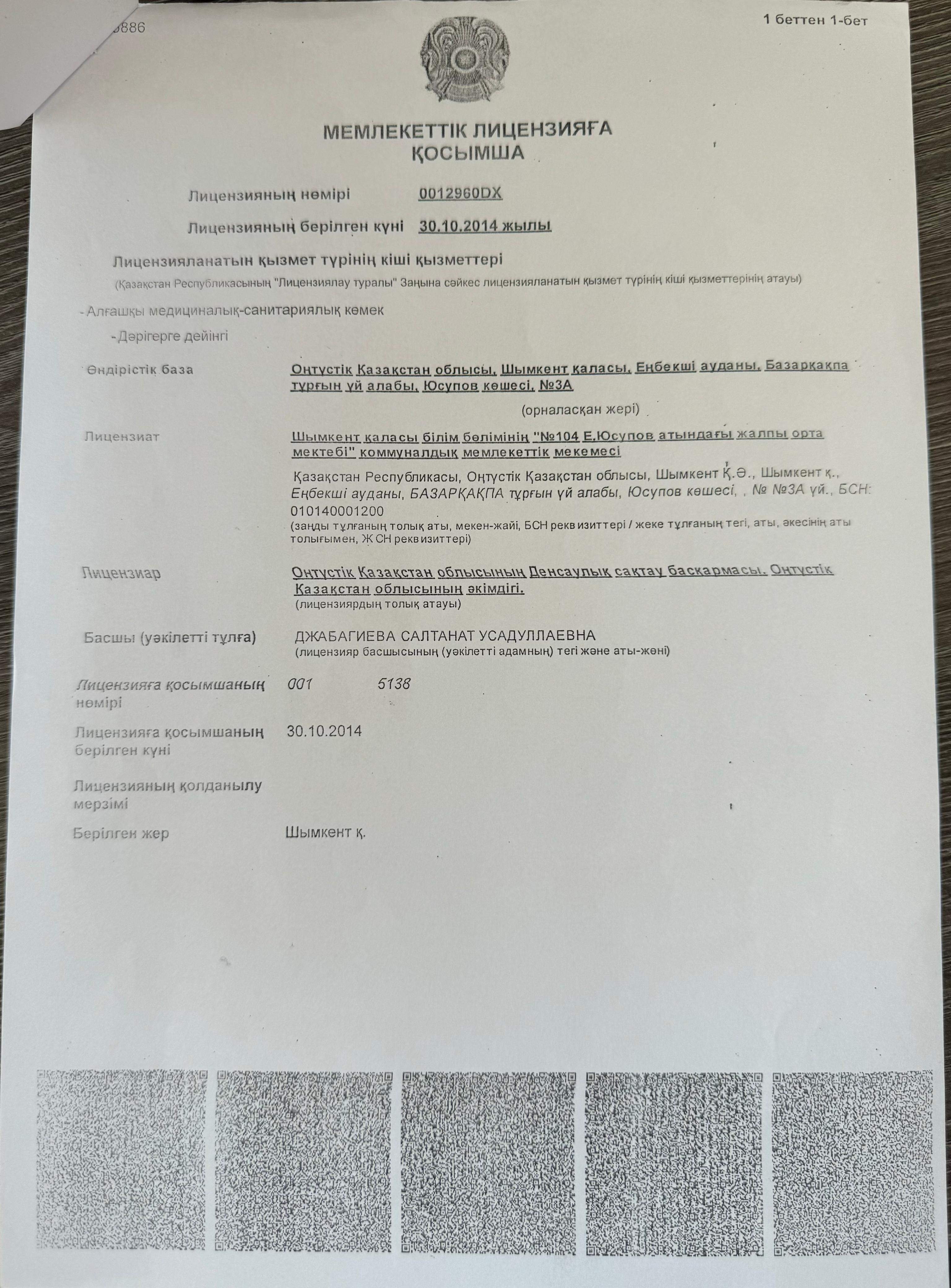 Мемлекеттік лицензия "Медициналық қызмет" » Общеобразовательная школа №104 имени Е. Юсупова