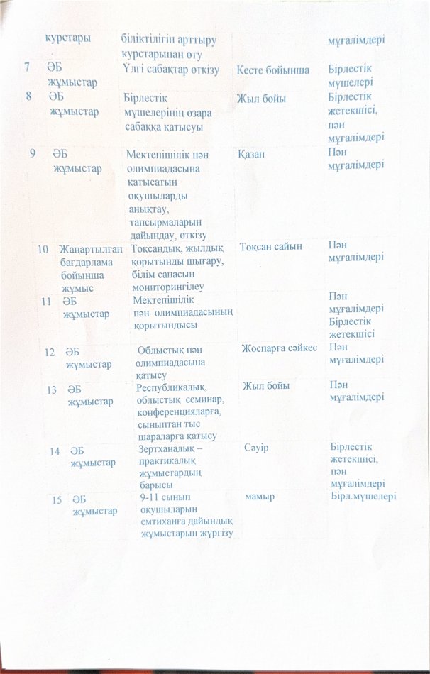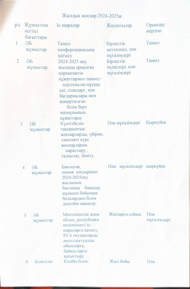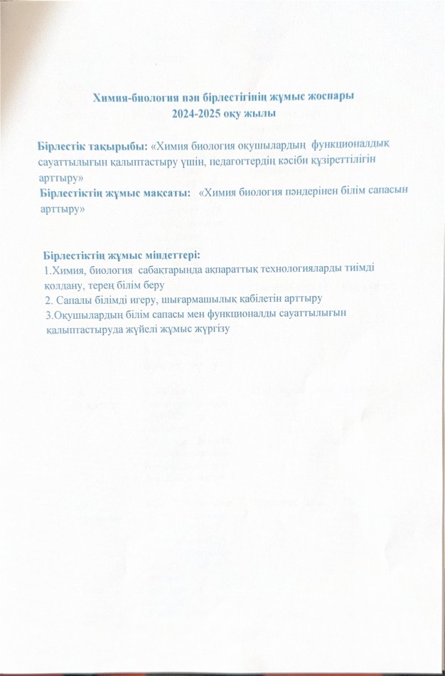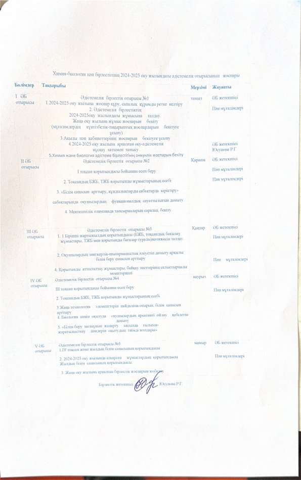 ХИМИЯ ЖӘНЕ БИОЛОГИЯ ӘДІСТЕМЕЛІК БІРЛЕСТІГІНІҢ 2024-2025 ОҚУ ЖЫЛЫНА ЖОСПАР » Общеобразовательная школа №104 имени Е. Юсупова