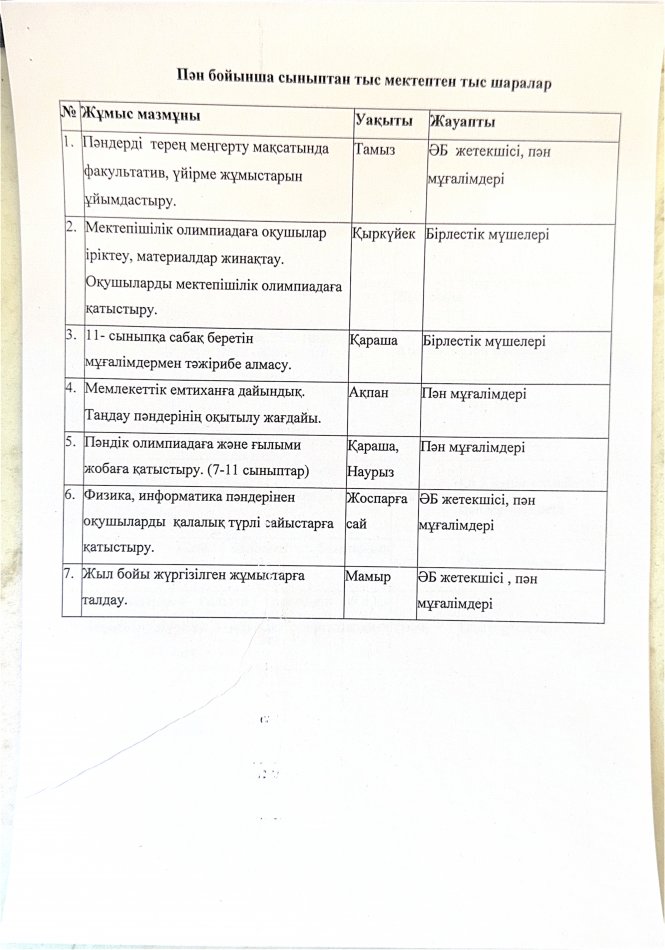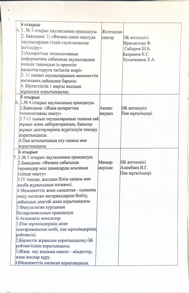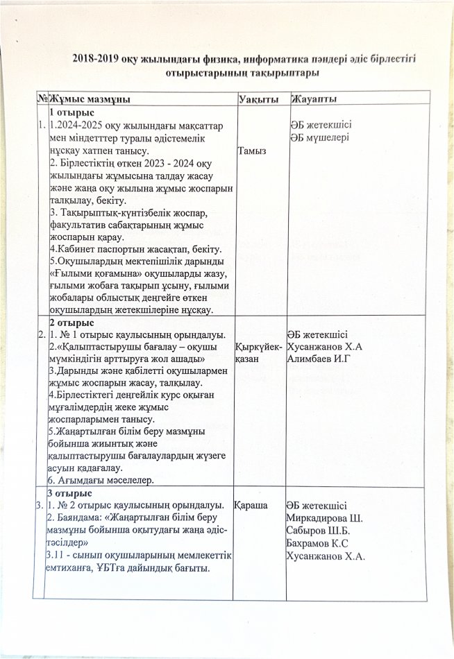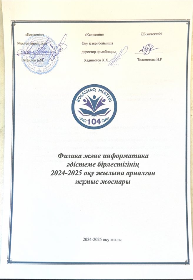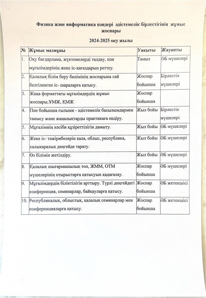 29 август 2024 0 1 2 3 4 5 ФИЗИКА ЖӘНЕ ИНФОРМАТИКА ӘДІСТЕМЕЛІК БІРЛЕСТІГІНІҢ 2024-2025 ОҚУ ЖЫЛЫНА ЖОСПАРЫ