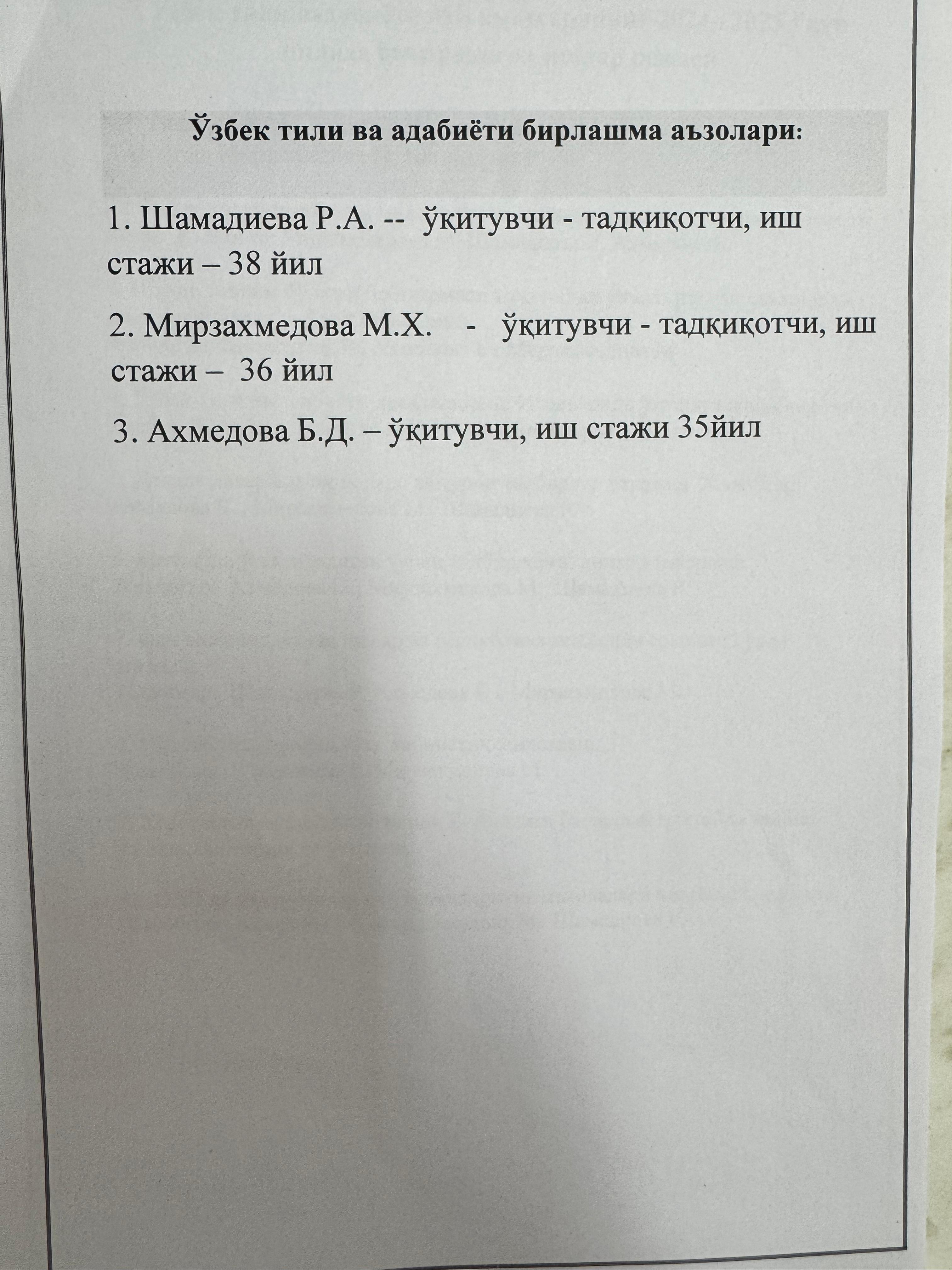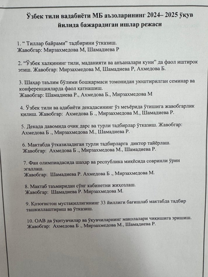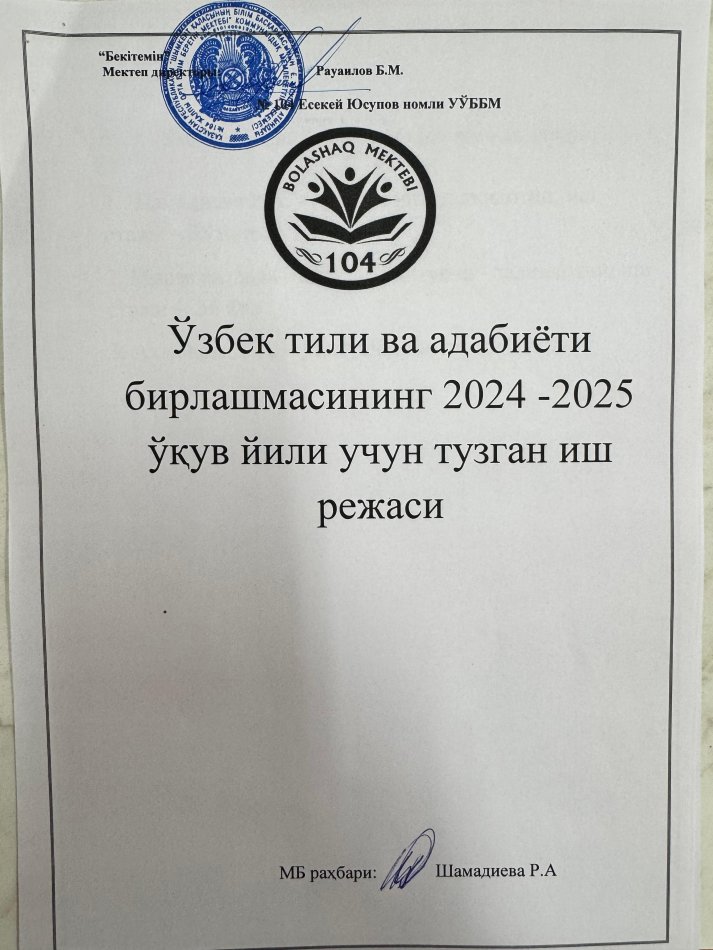 29 август 2024 0 1 2 3 4 5 ӨЗБЕК ТІЛІ МЕН ӘДЕБИЕТІ ӘДІСТЕМЕЛІК БІРЛЕСТІГІНІҢ 2024-2025 ОҚУ ЖЫЛЫНА ЖОСПАРЫ