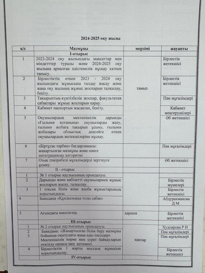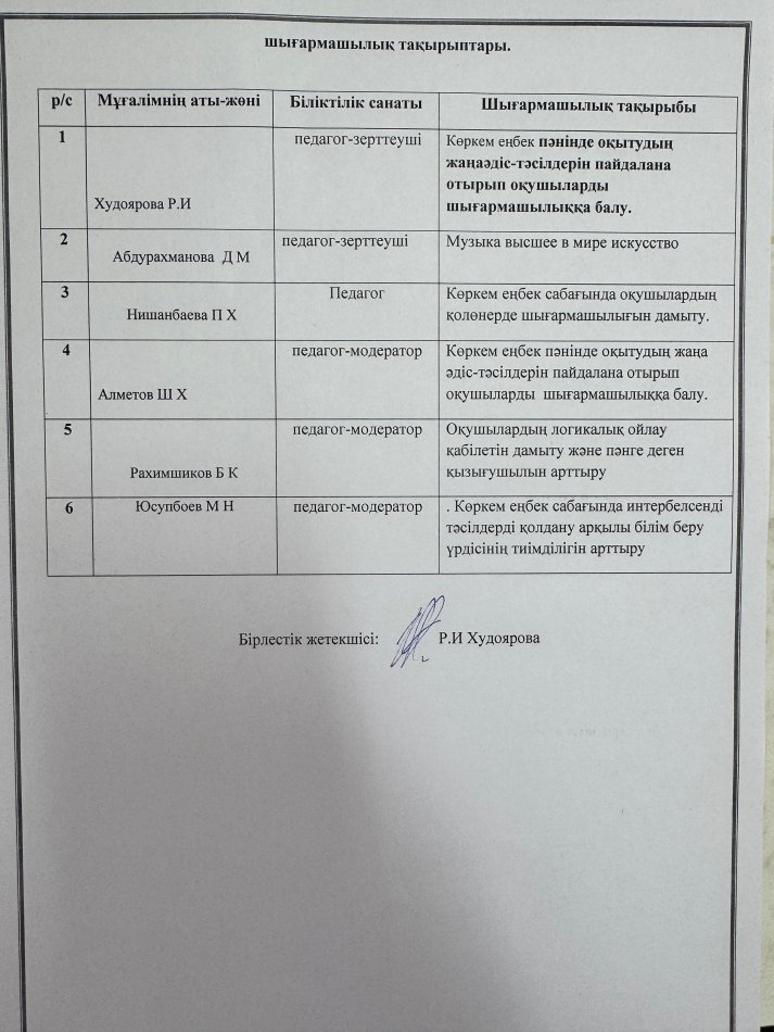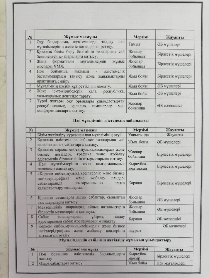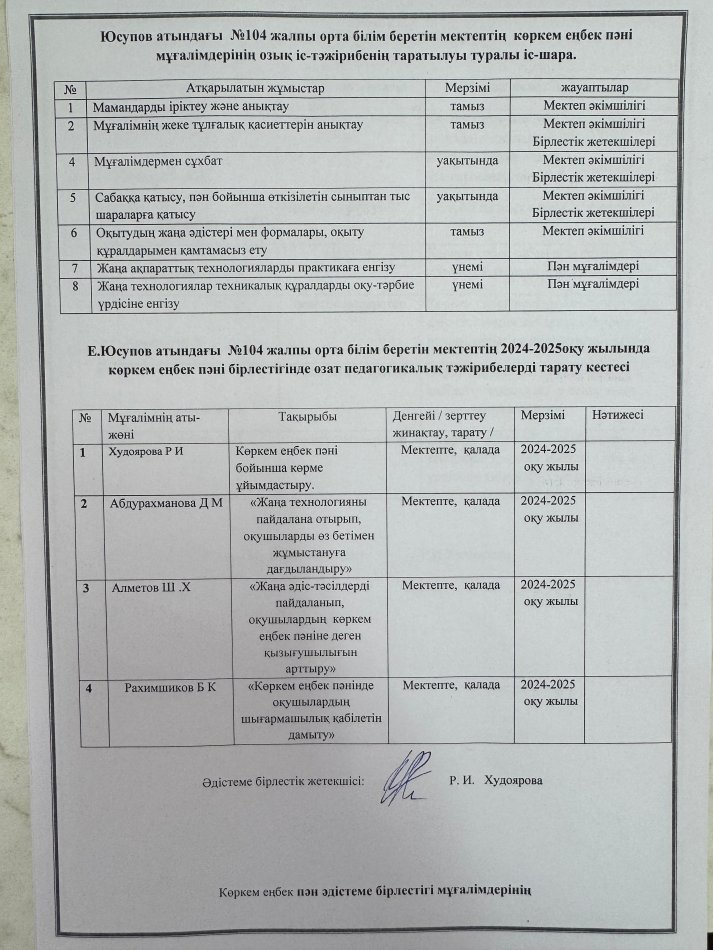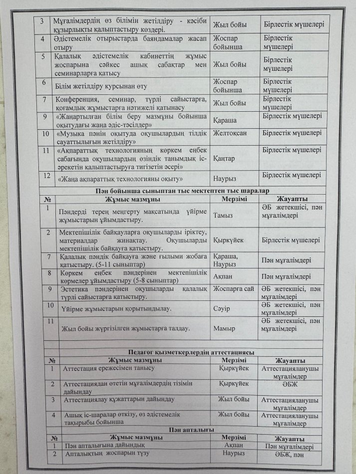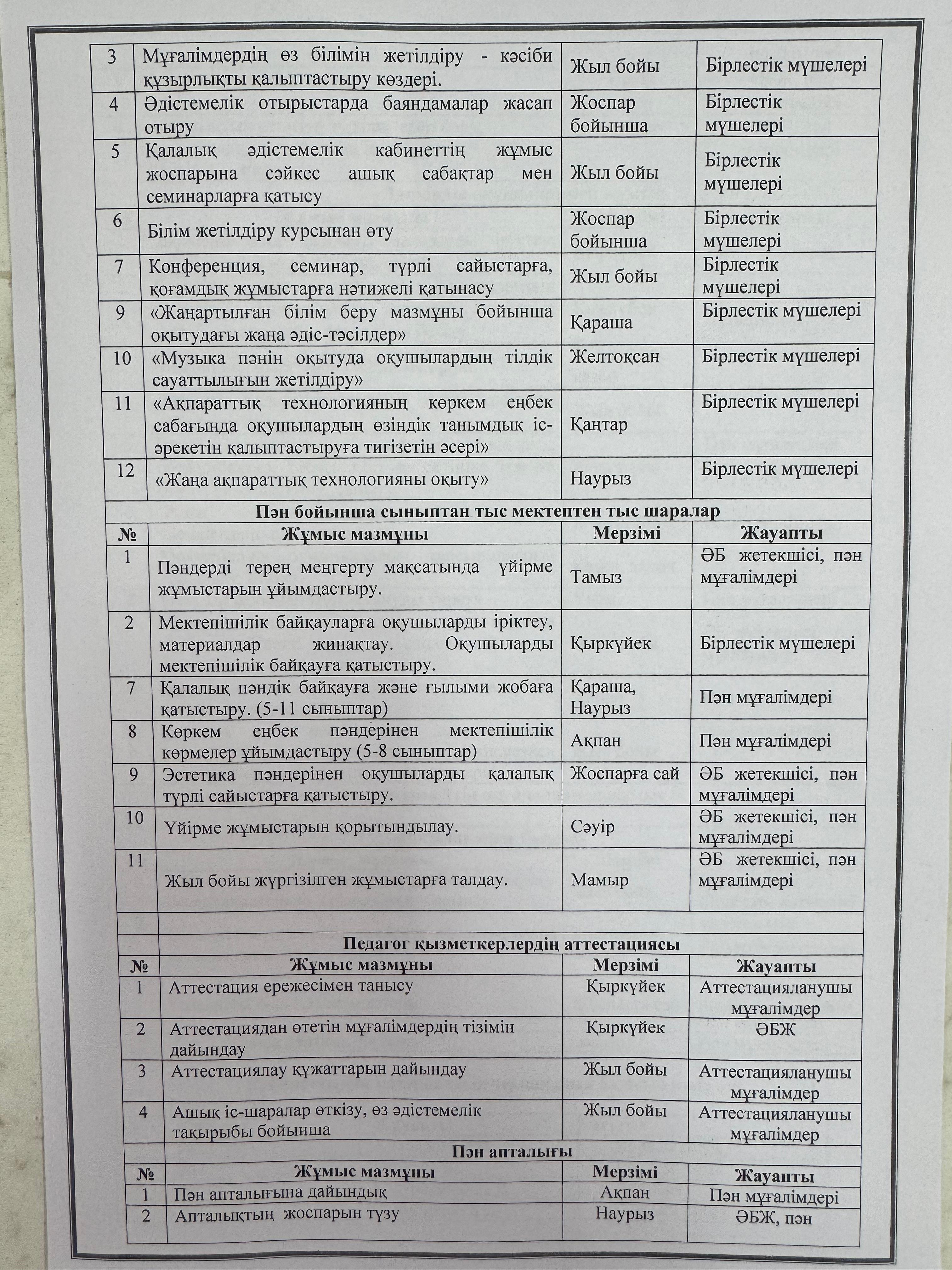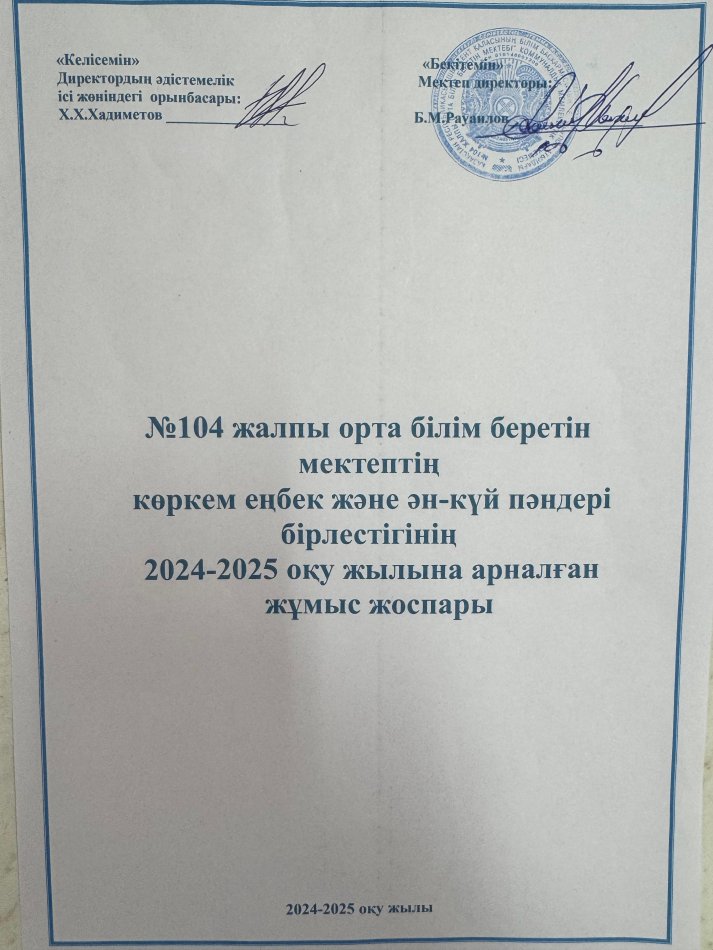 29 август 2024 0 1 2 3 4 5 КӨРКЕМ ЕҢБЕК ЖӘНЕ ӘН-КҮЙ ӘДІСТЕМЕЛІК БІРЛІСТІГІНІҢ 2024-2025 ОҚУ ЖЫЛЫНА ЖОСПАРЫ