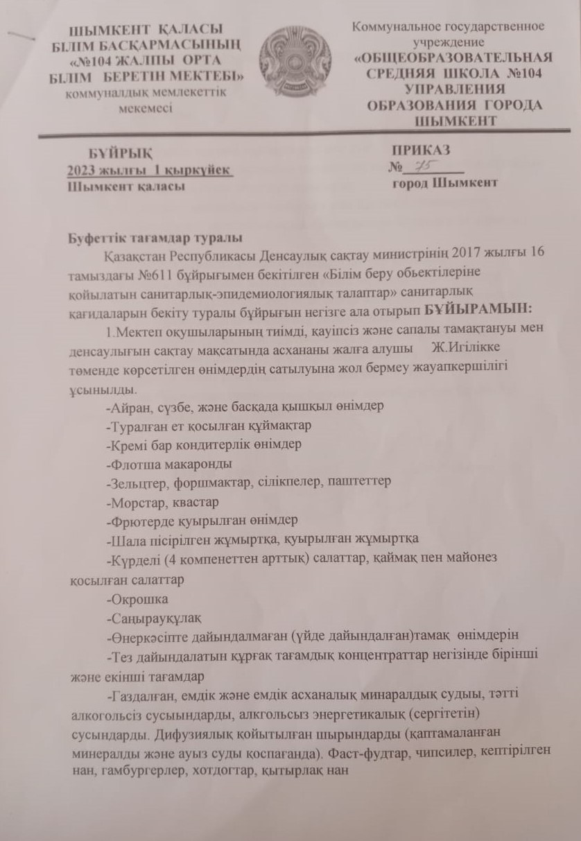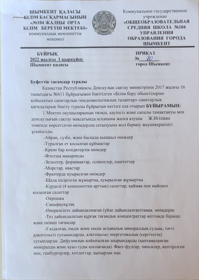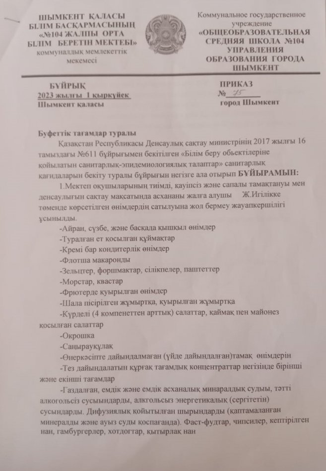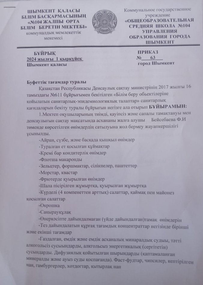 Буфеттік тағамдар туралы бұйрық (2023-2024, 2024-2025 оқу жылдары) » Общеобразовательная школа №104 имени Е. Юсупова