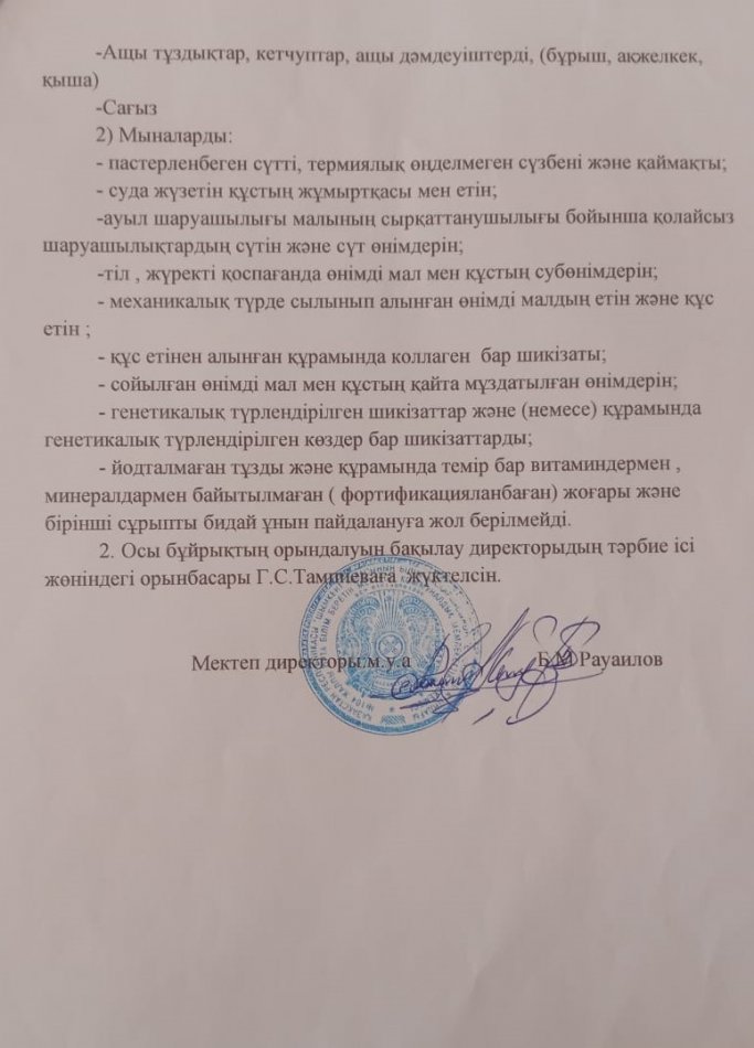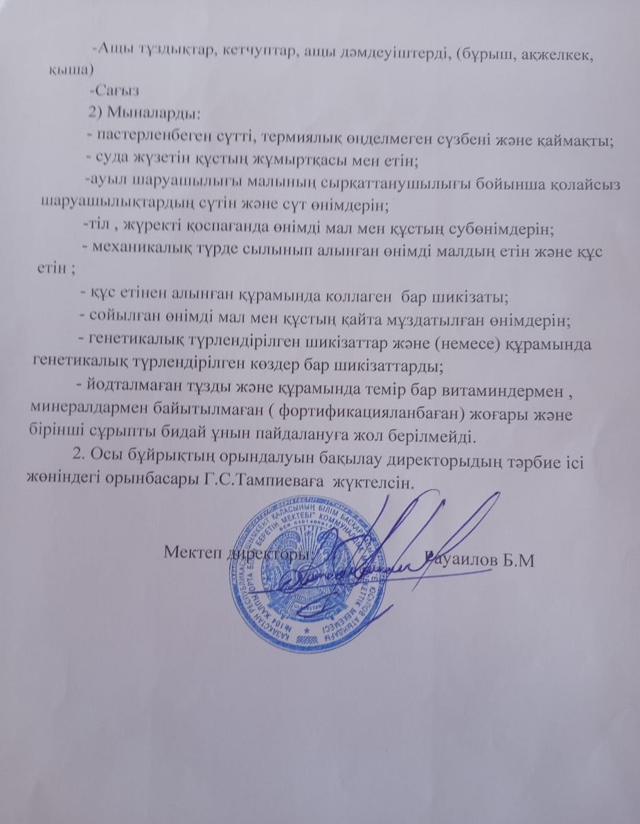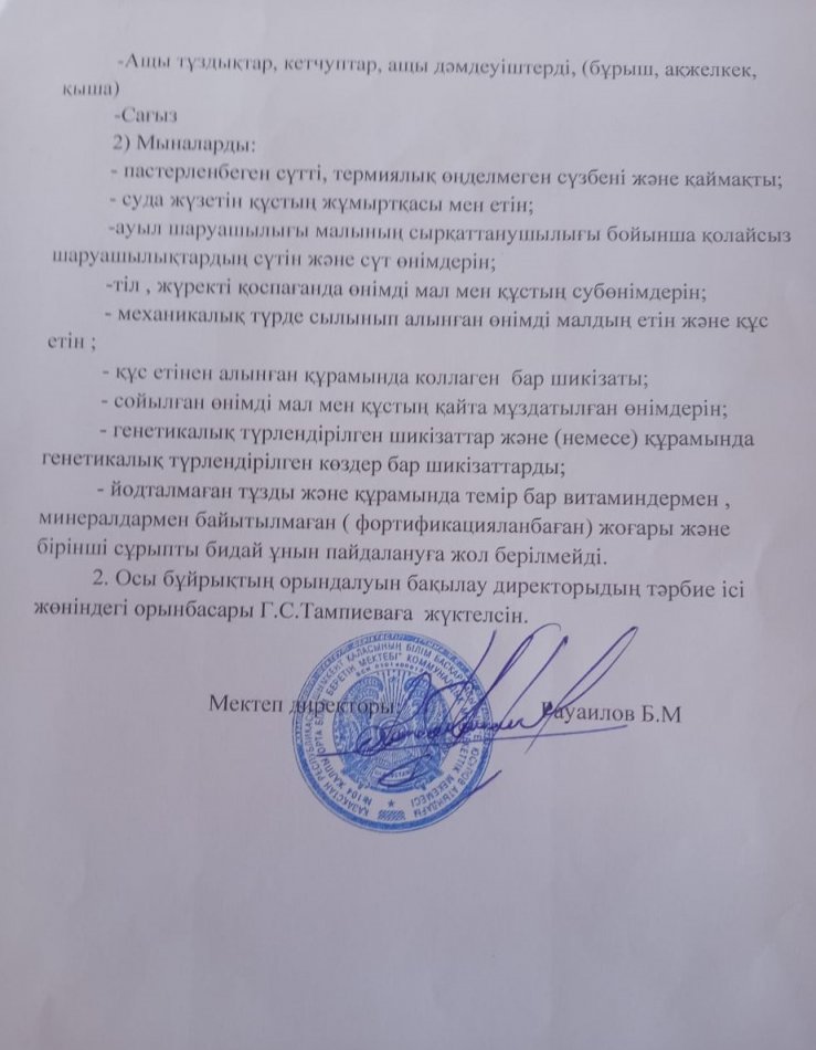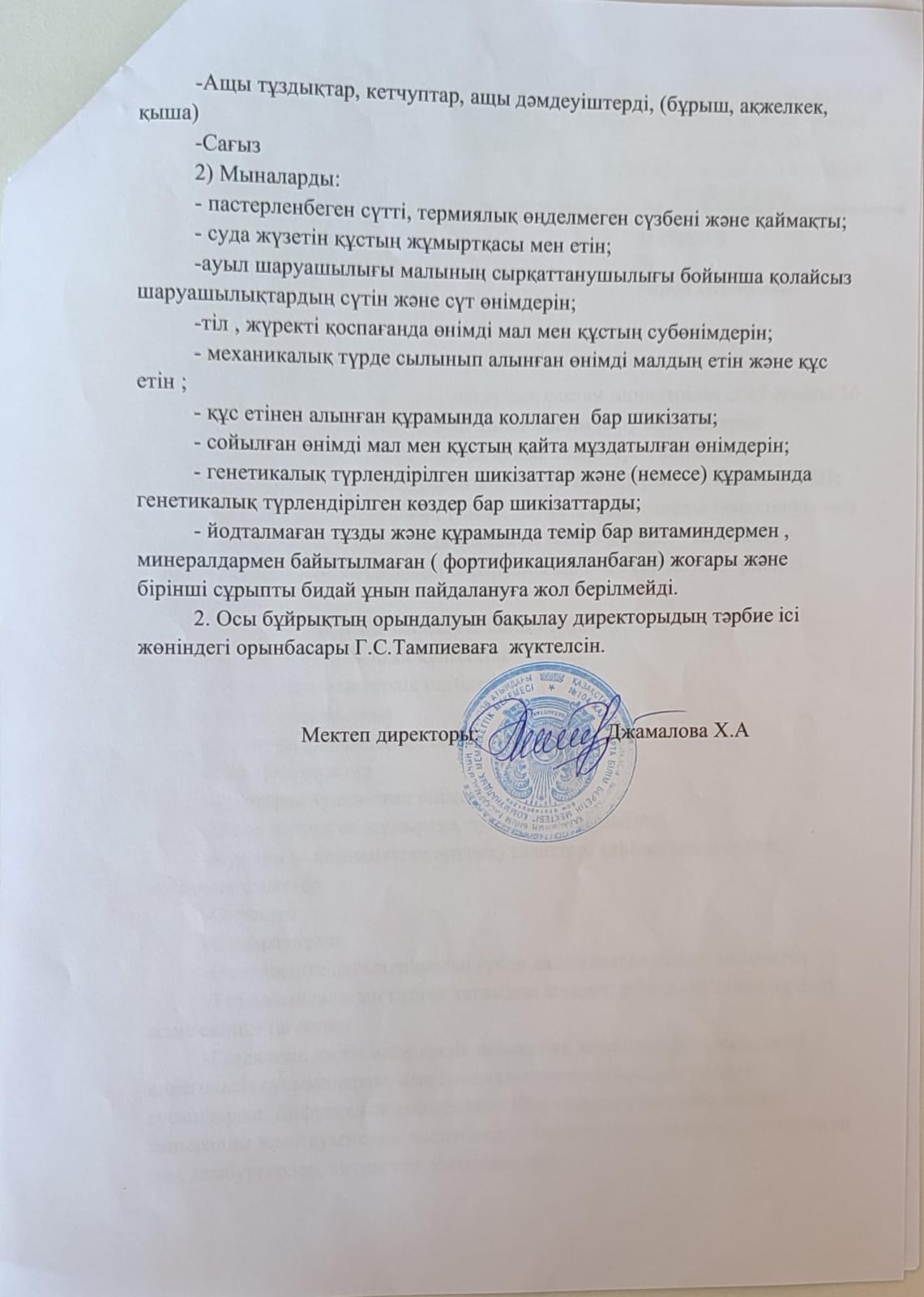 Буфеттік тағамдар туралы бұйрық (2023-2024, 2024-2025 оқу жылдары) » Общеобразовательная школа №104 имени Е. Юсупова